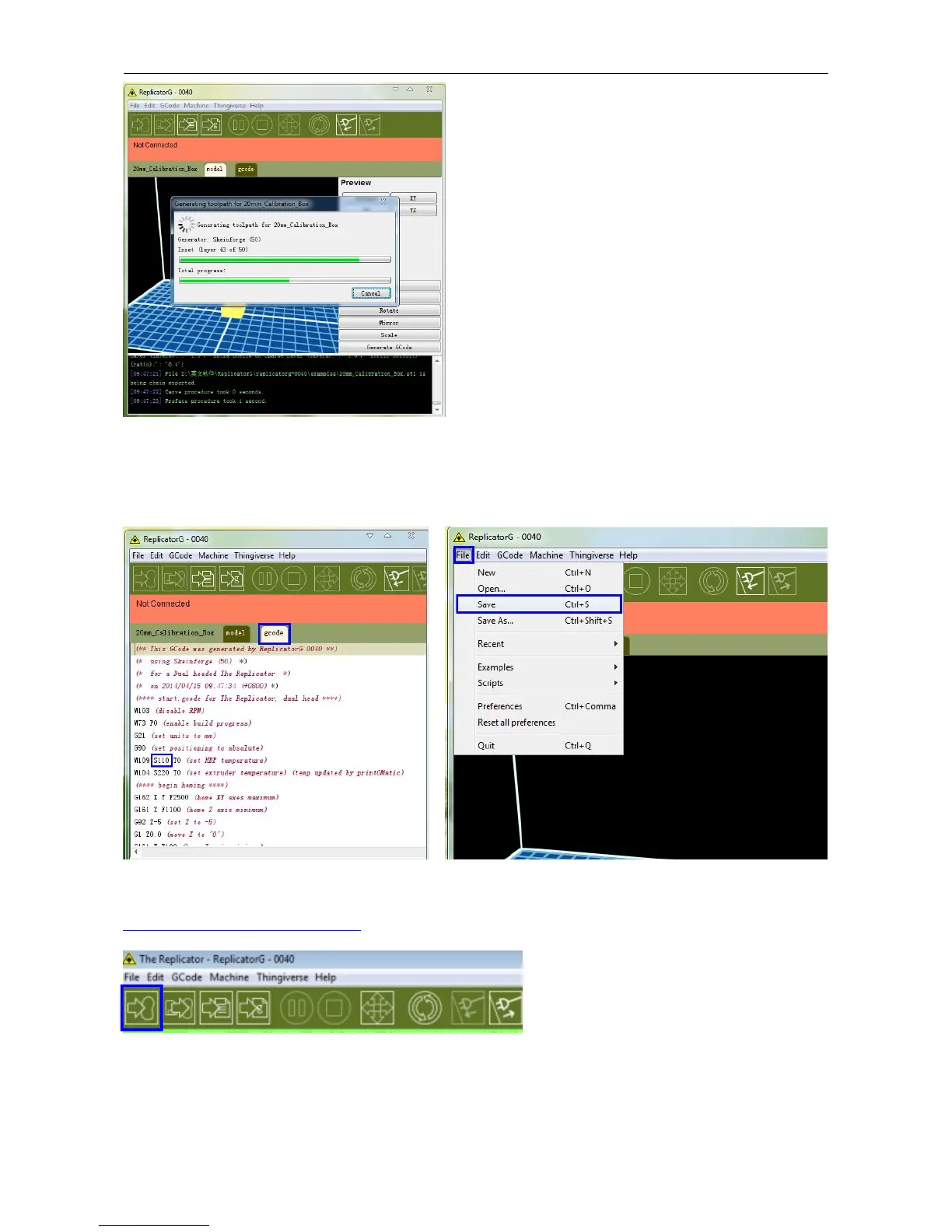 If you have connected Replicator G 3D Printer printer, click the left most button on the green bar near the top of the