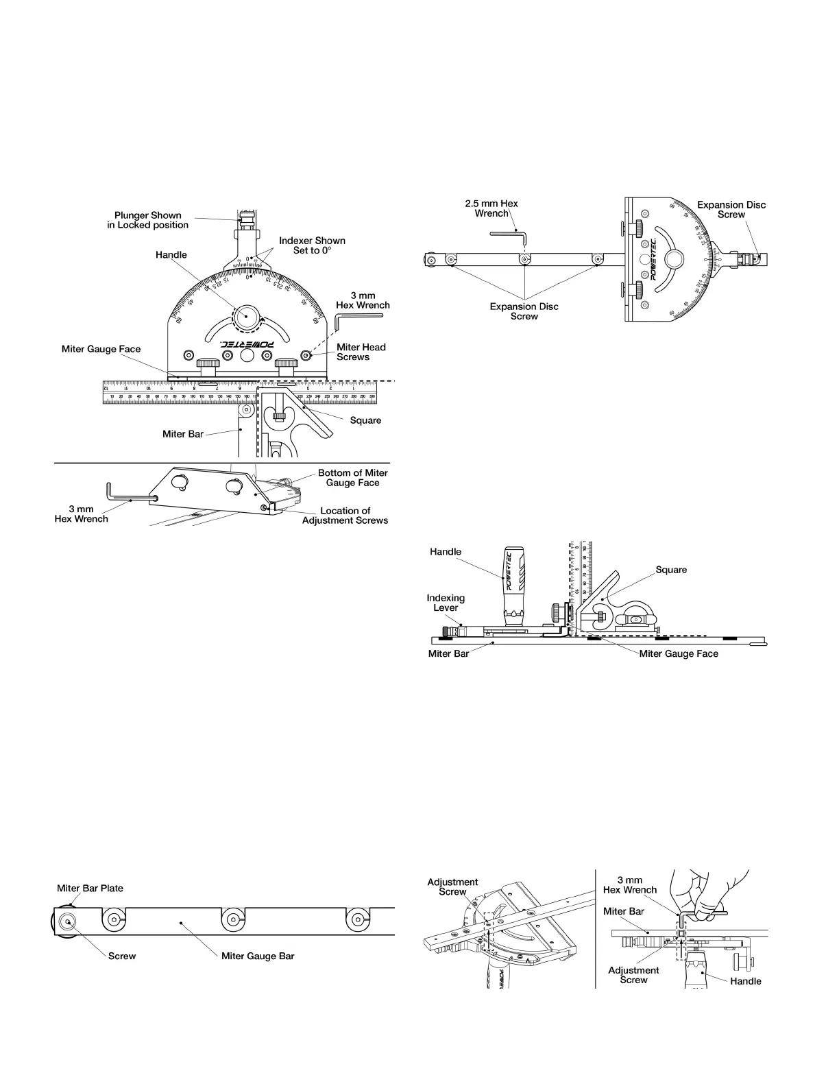 See Figures 6, 7. The miter bar features an adjustment screw that