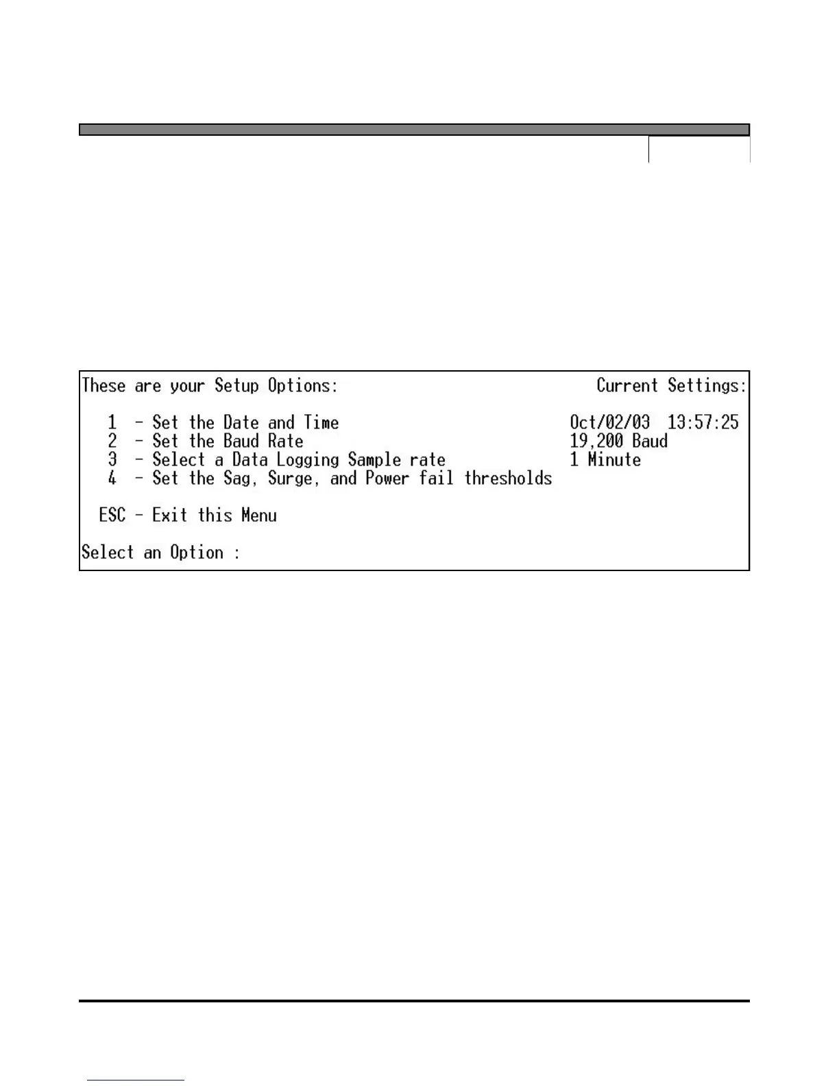 powertronics PQR D52 - Hardware Configuration via Serial; Accessing Setup Options Menu; Current Settings Display