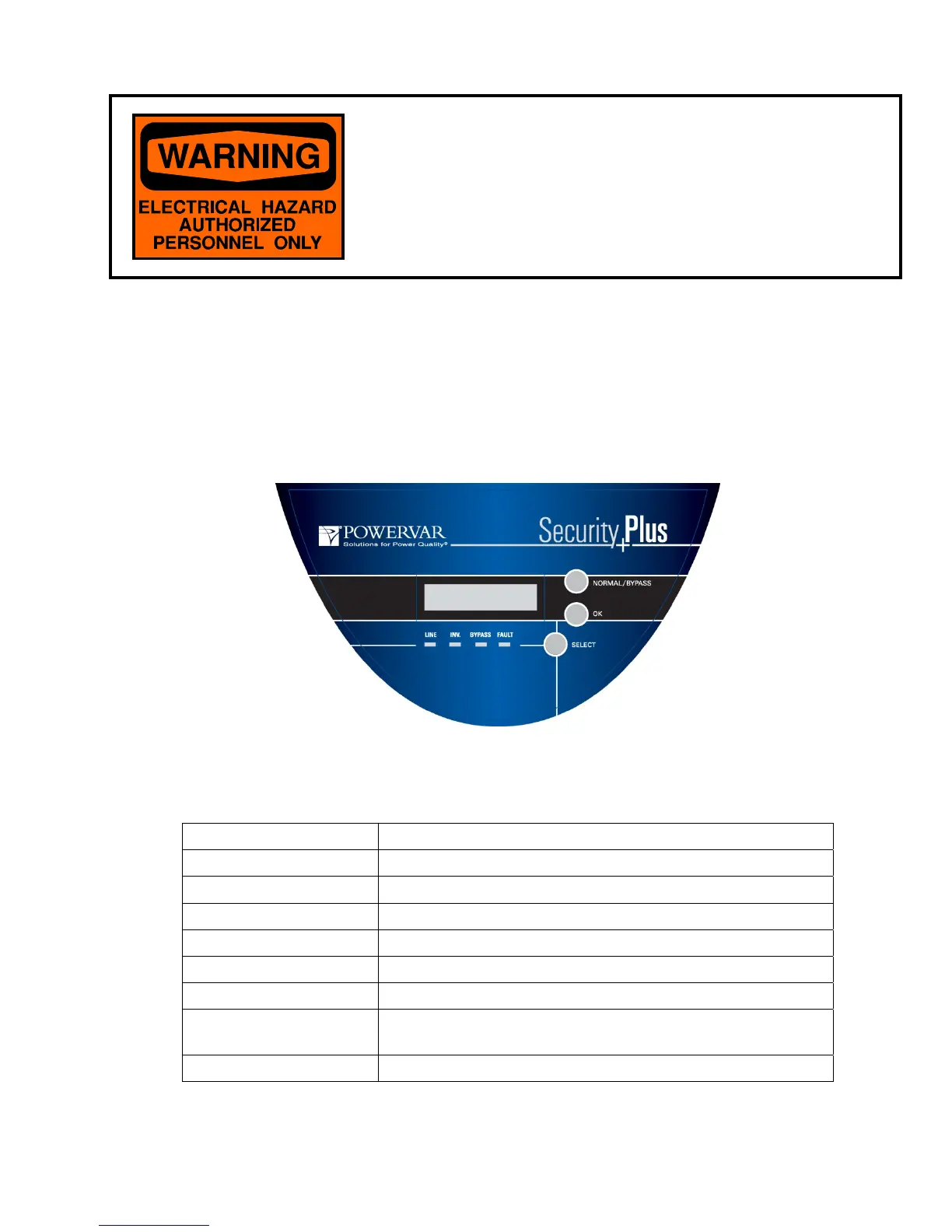The operator panel layout of the Security Plus UPS is illustrated in Fig. 2-1 and Table 2-1.