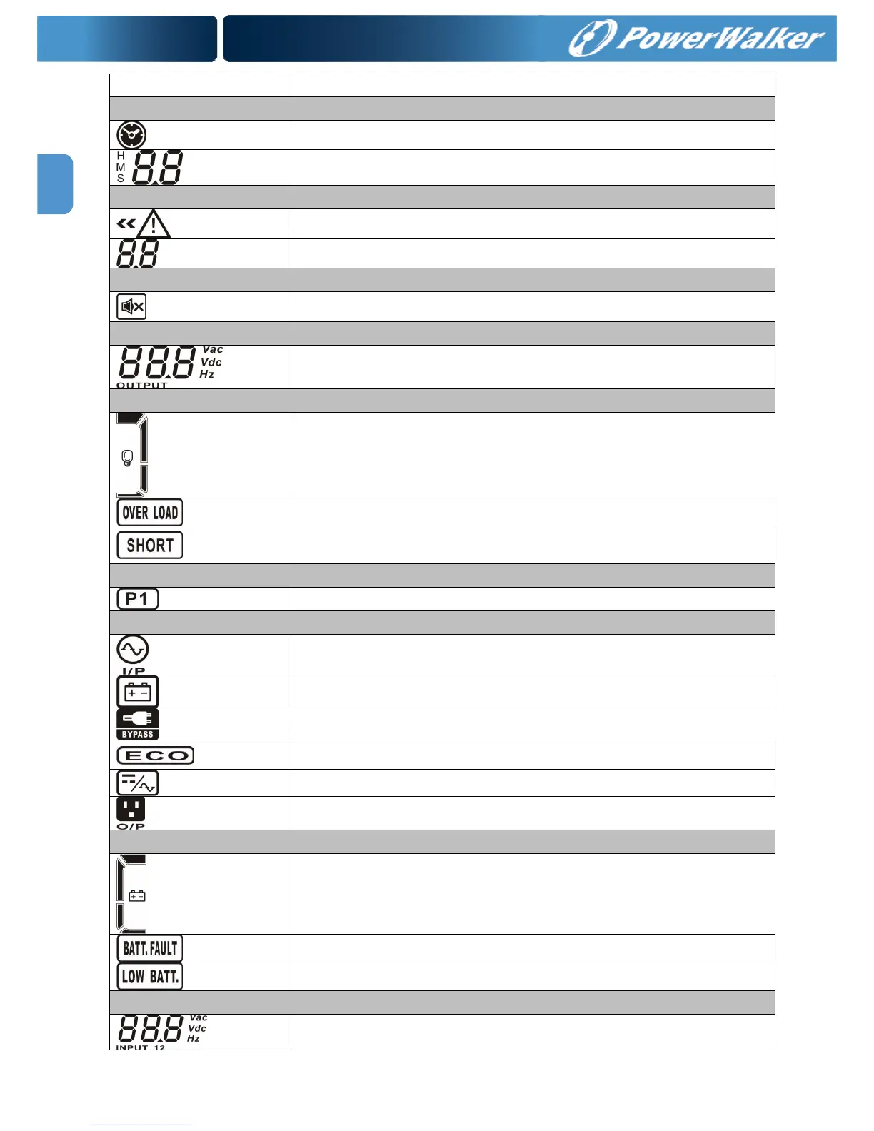 Indica la tensión de salida, frecuencia, o tensión batería.
