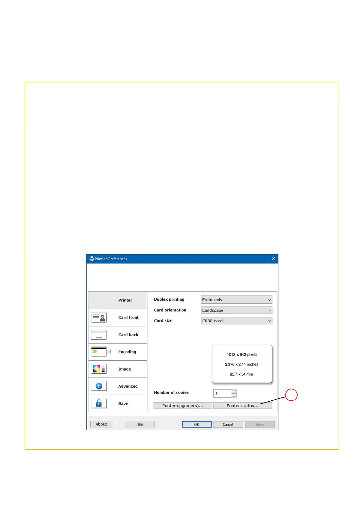 3. Click on the Printer Status… button (1). The printer should show as ‘connected’ (please see the following