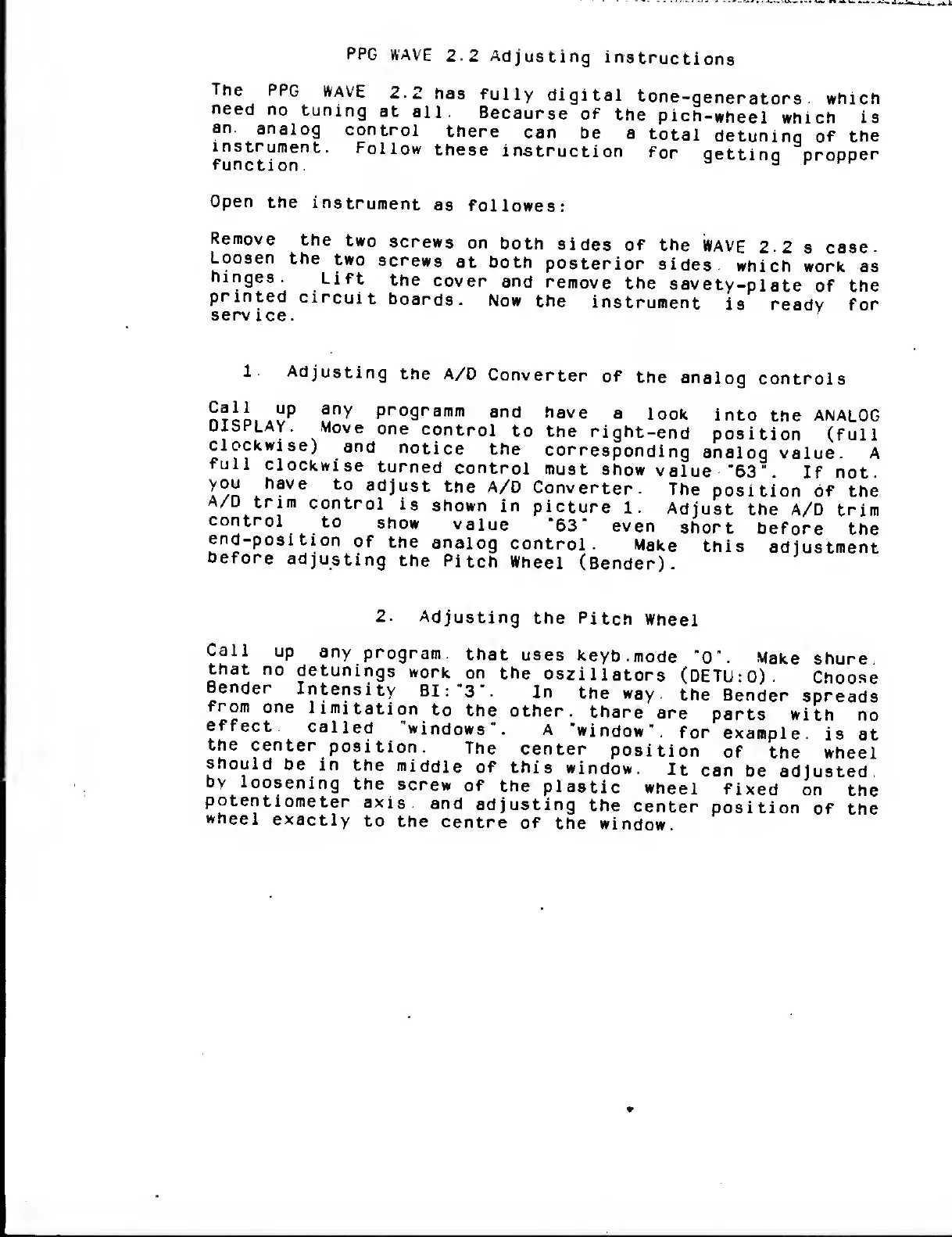 PPG wave 2.2 - PPG WAVE 2.2 Adjusting Instructions; Adjusting the A;D Converter of the analog controls; Adjusting the Pitch Wheel