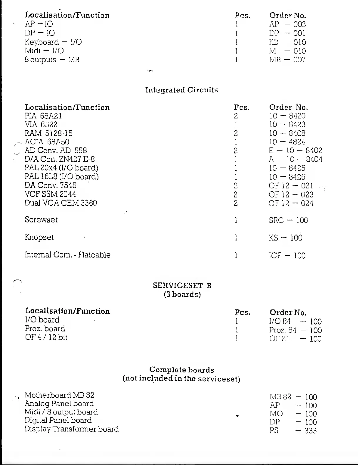 PPG wave 2.2 - Integrated Circuits; Integrated Circuit List; Service Set B - 3 Boards; Complete Boards