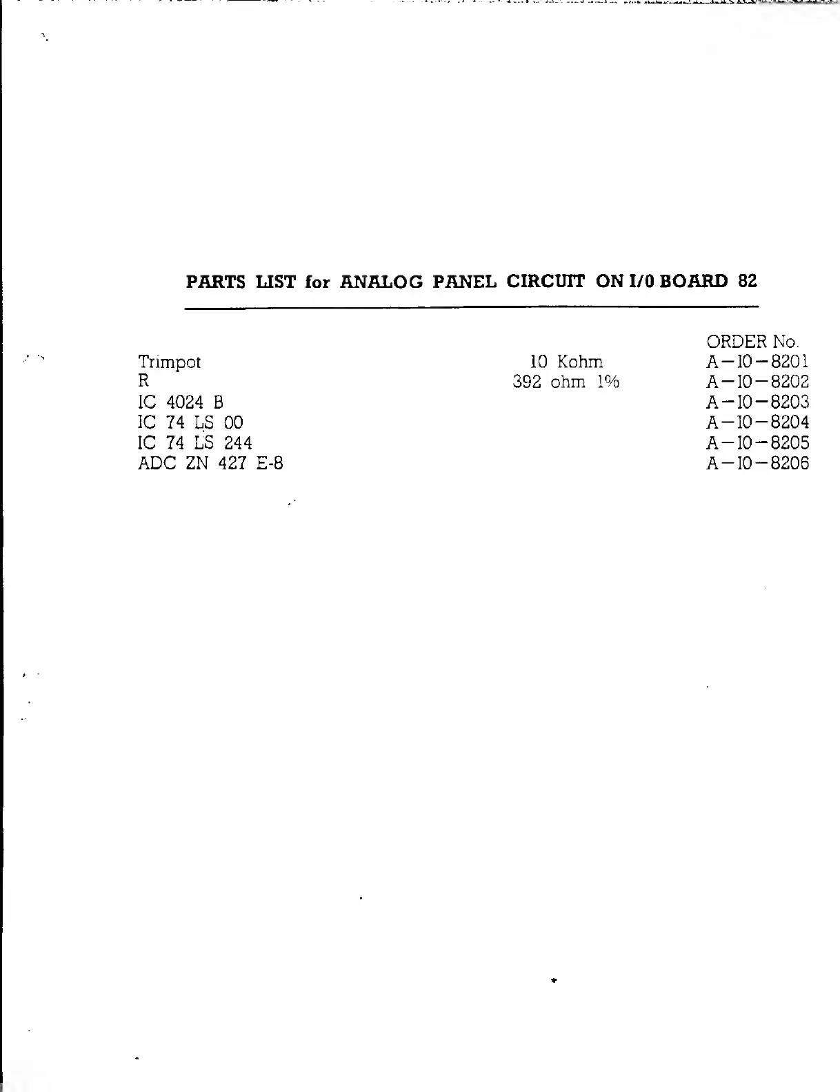 PPG wave 2.2 - Parts List for Analog Panel Circuit on I;O Board 82