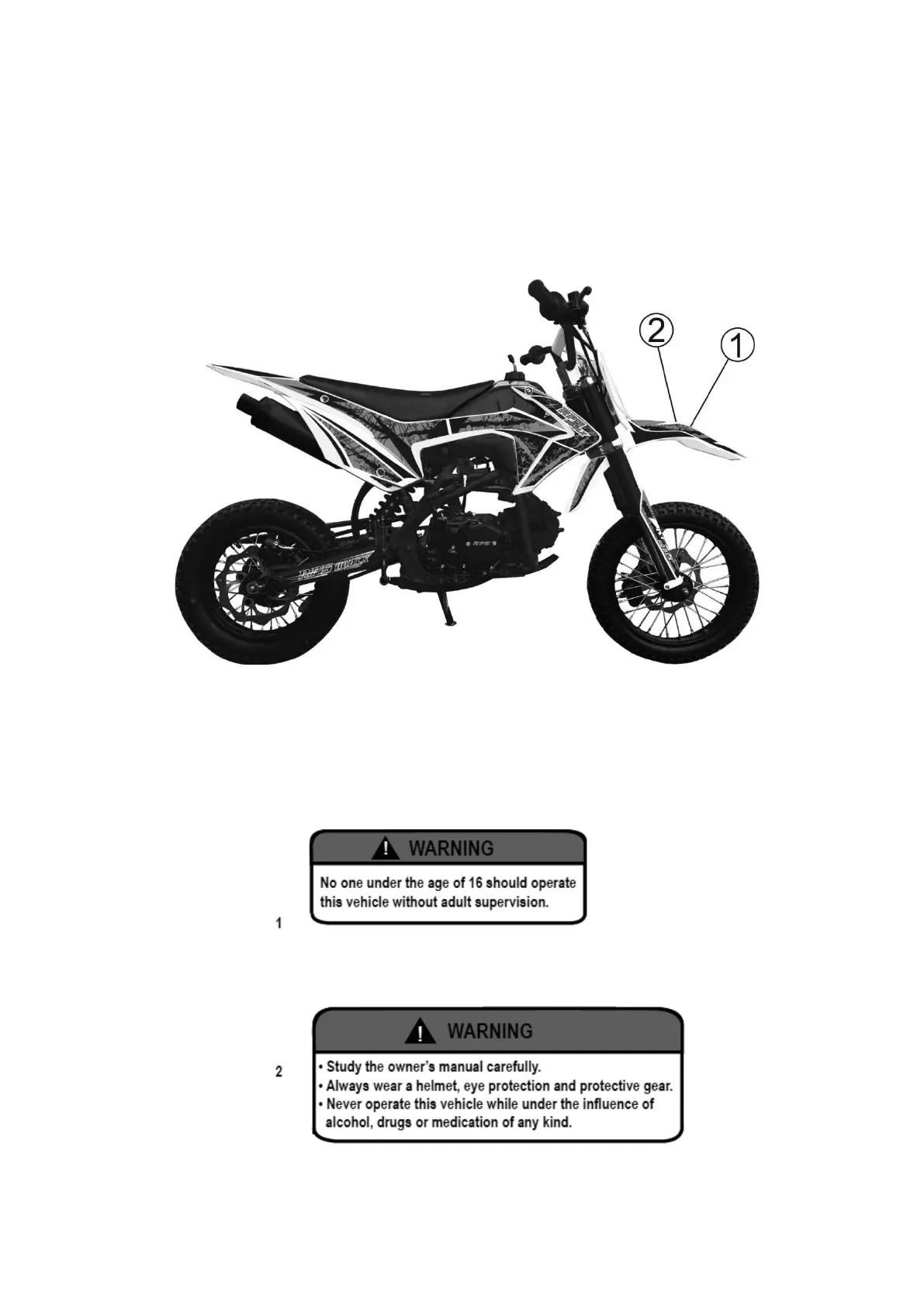 labels. Keep the labels on the Dirt bike. Do not remove them for any reason. If a label come