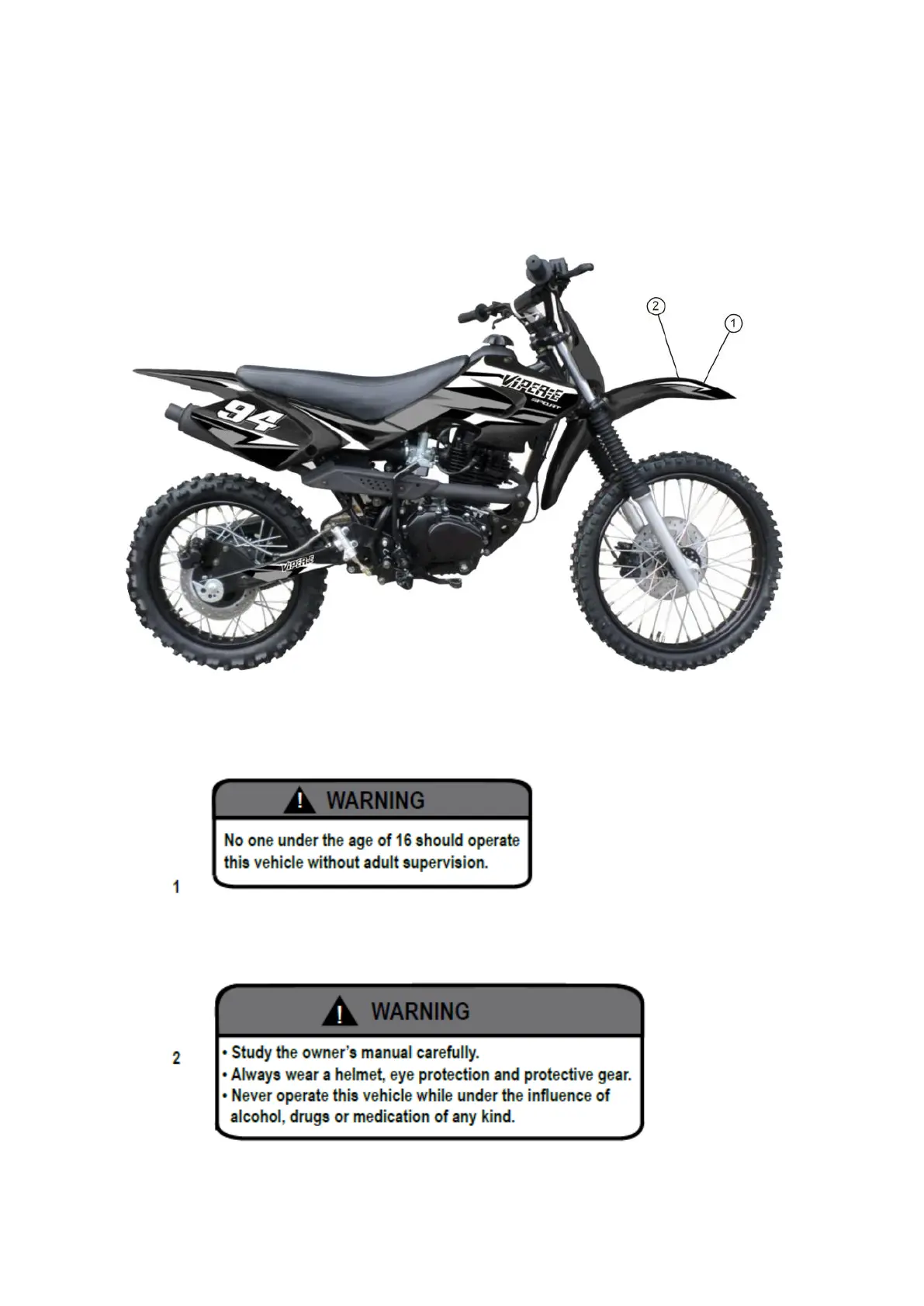 labels. Keep the labels on the Dirt bike. Do not remove them for any reason. If a label come off or