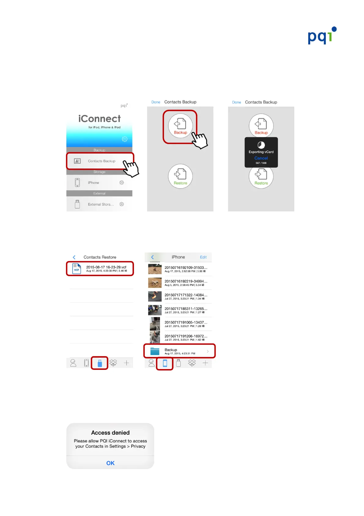 1. Enter!the!PQI!iConnect+!App,!select!“Contacts!Backup!!“Backup”.!Your!
