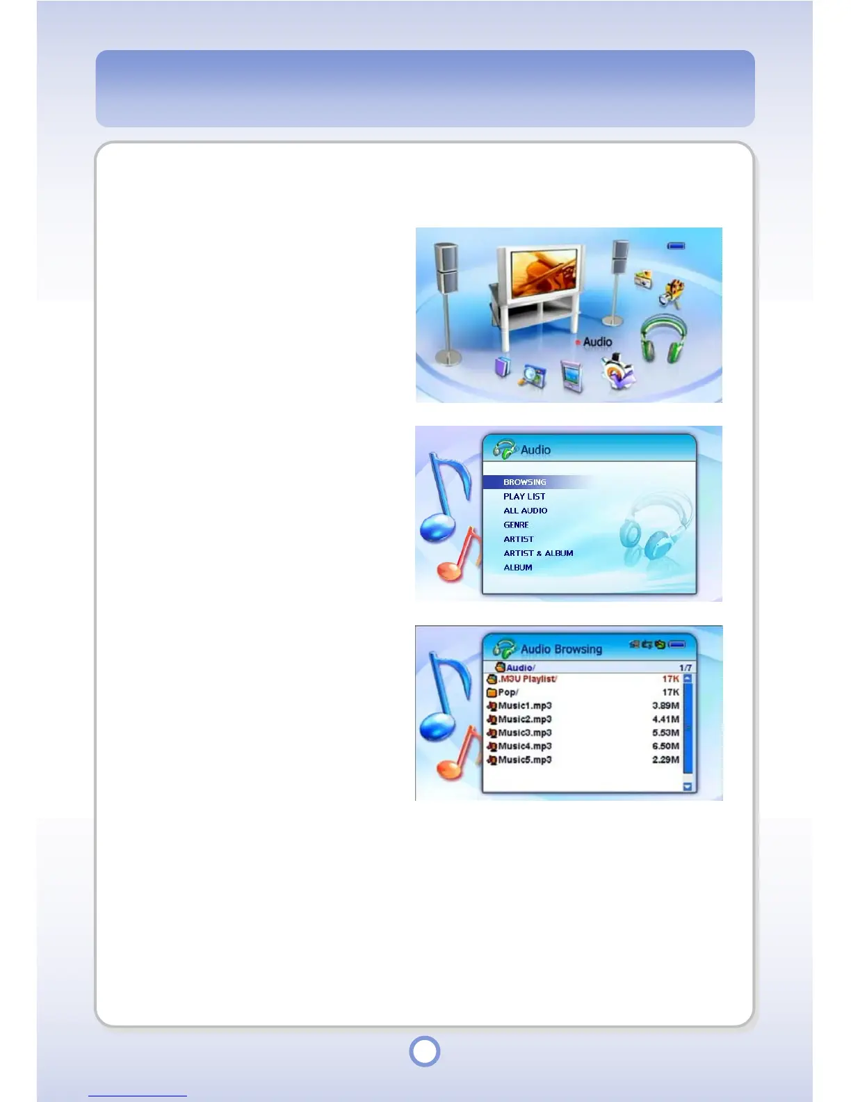 When you select this menu, sub folders and files in the Audio folder are displayed.
