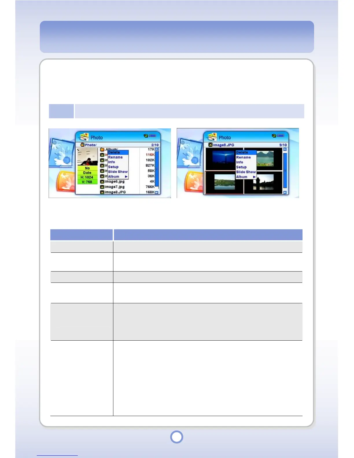 You can view photo files in Slide Show. To exit Slide Show, press the