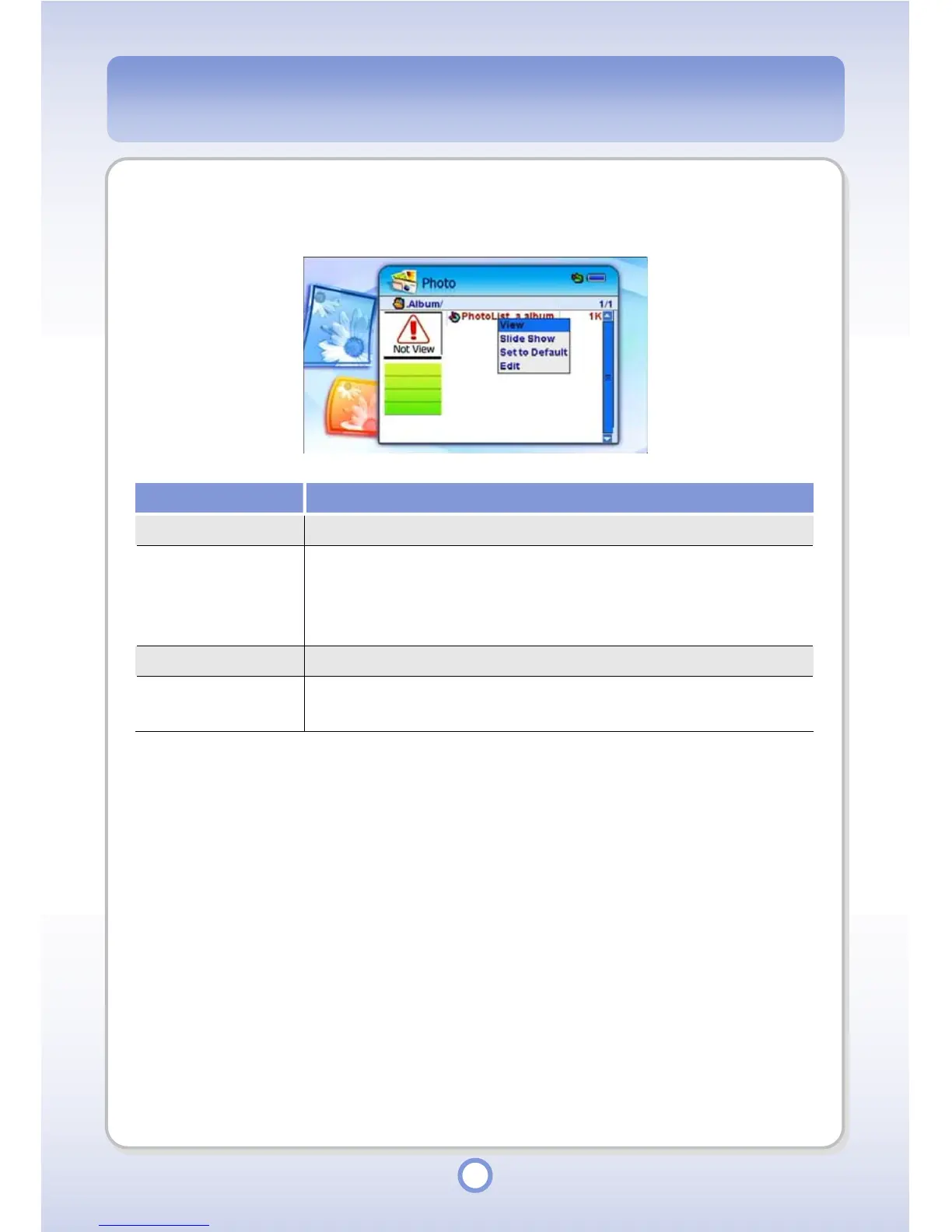 View You can view photo files in the album in full screen.