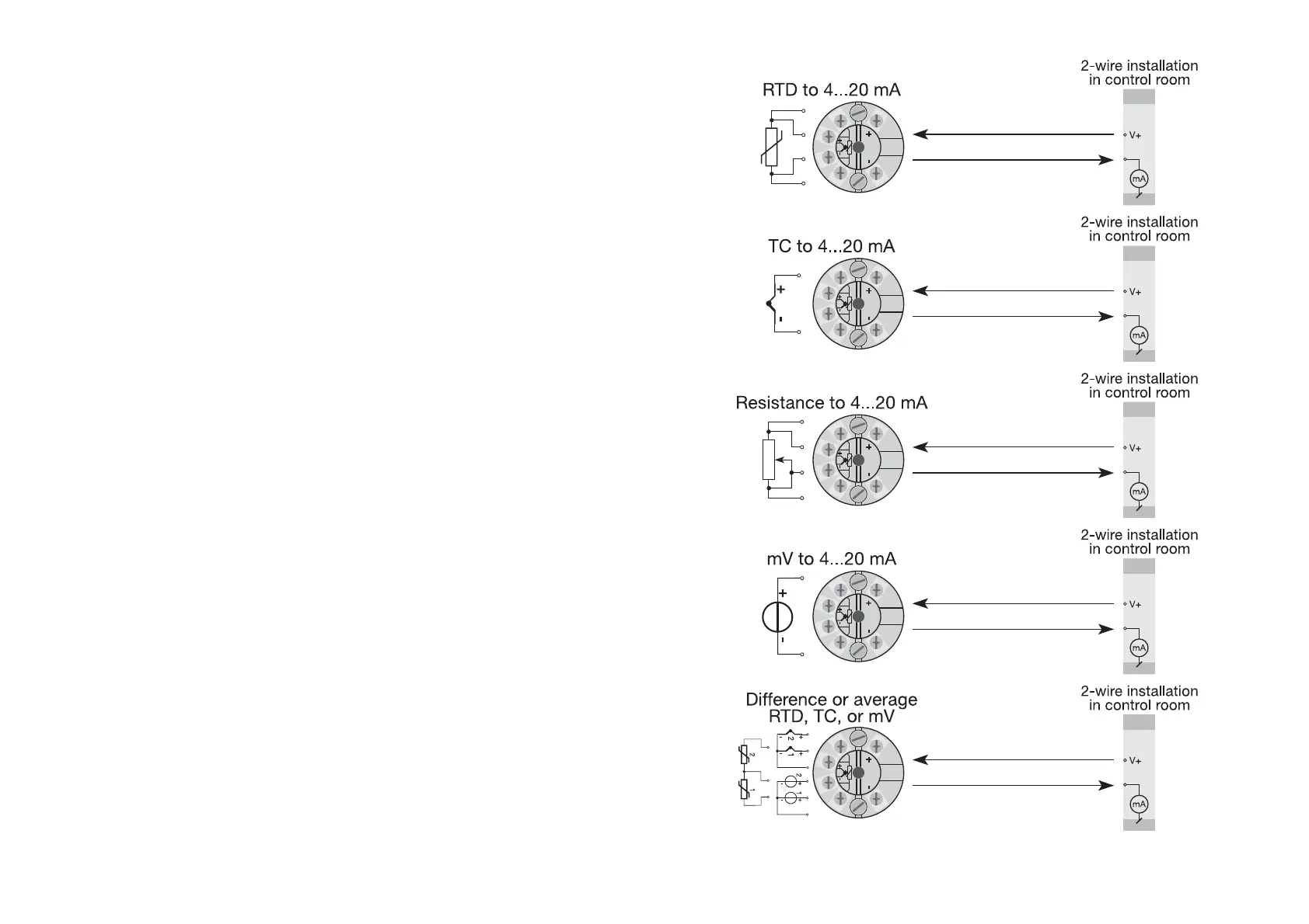 • Difference or average temperature measurement of 2 resistance or TC sensors.