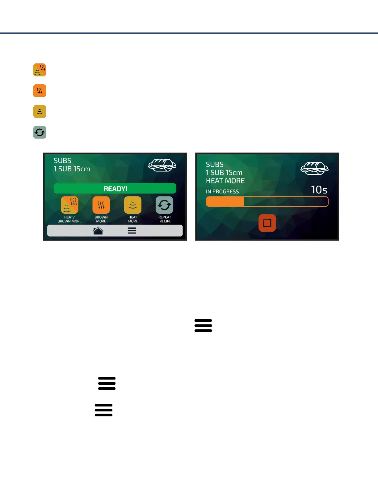 Example: If the icon was pressed from the Recipes screen, pushing it once more will return to