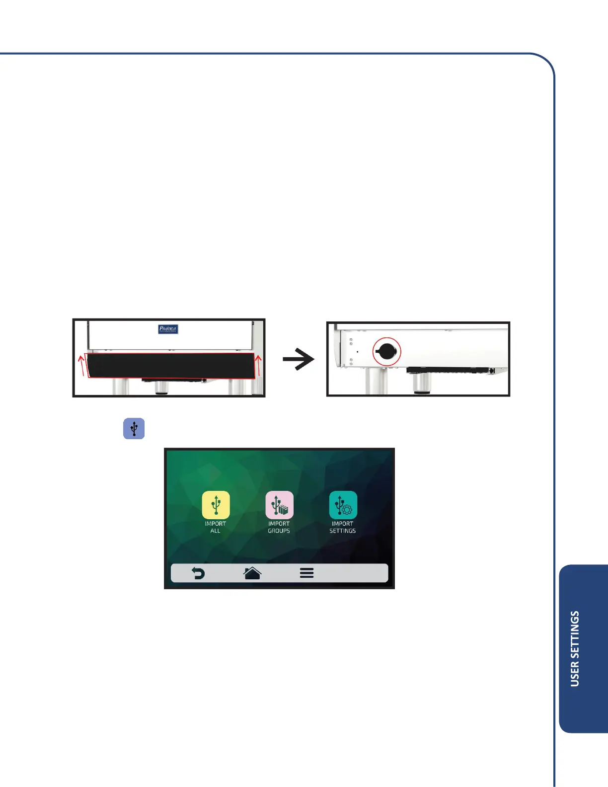 Press the icon . The function available in USB are: Import, Export and Update System.
