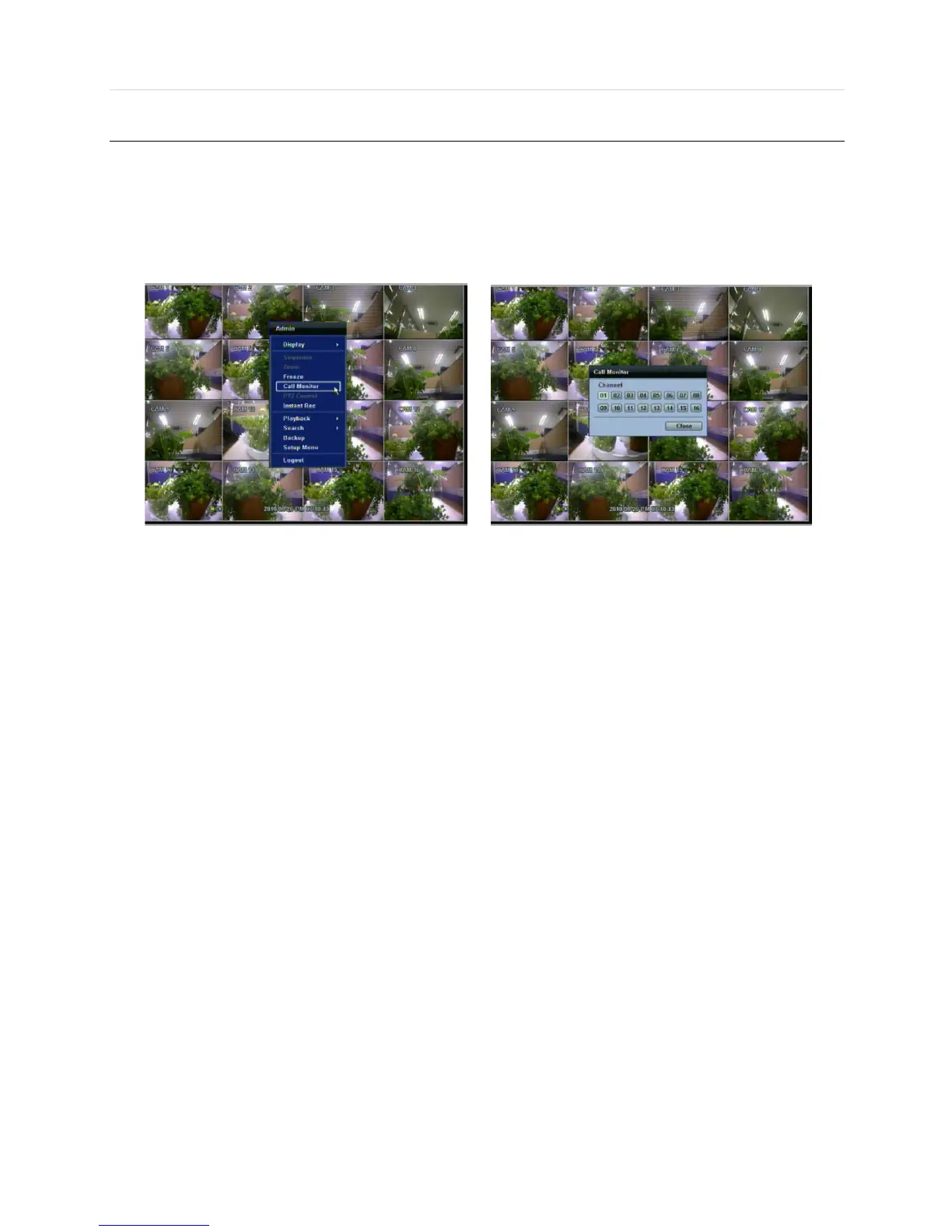 Press the CALL MON button on the front panel, or click the right button on the mouse and select the CALL MONITOR in order