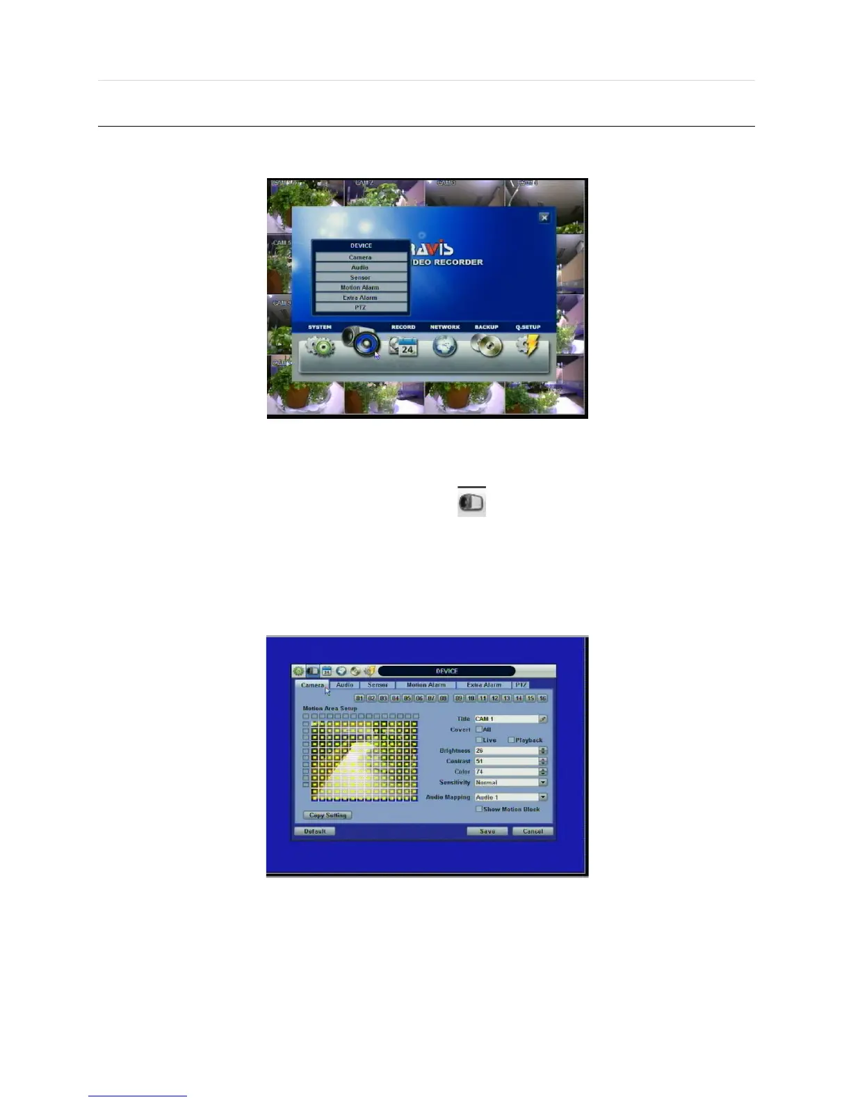 Users can setup camera title, covert, brightness, contrast, motion sensitivity, and audio mapping for each camera.