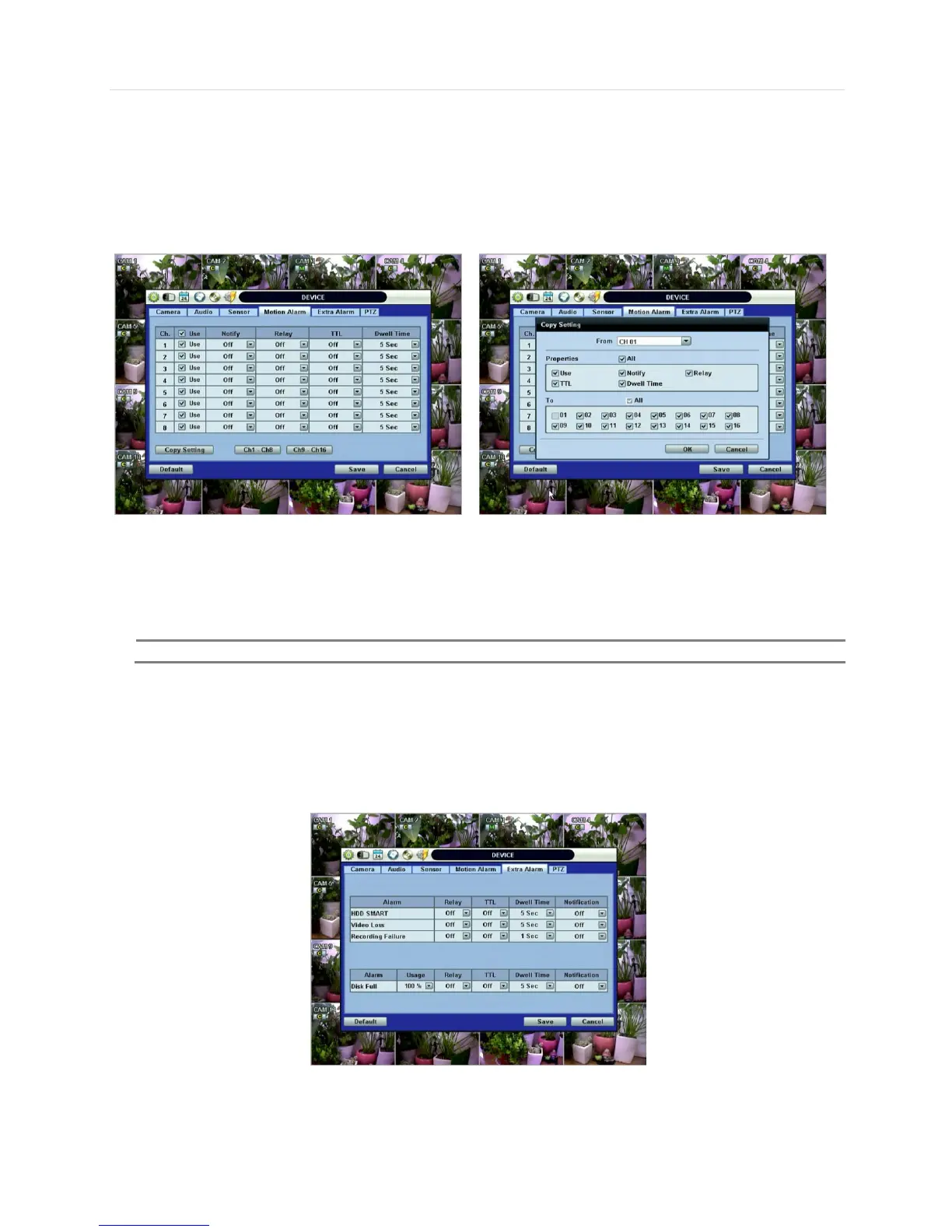 for the selected post-alarm dwell time and pre-alarm video will also record for the specified time. An alarm signal is sent via the