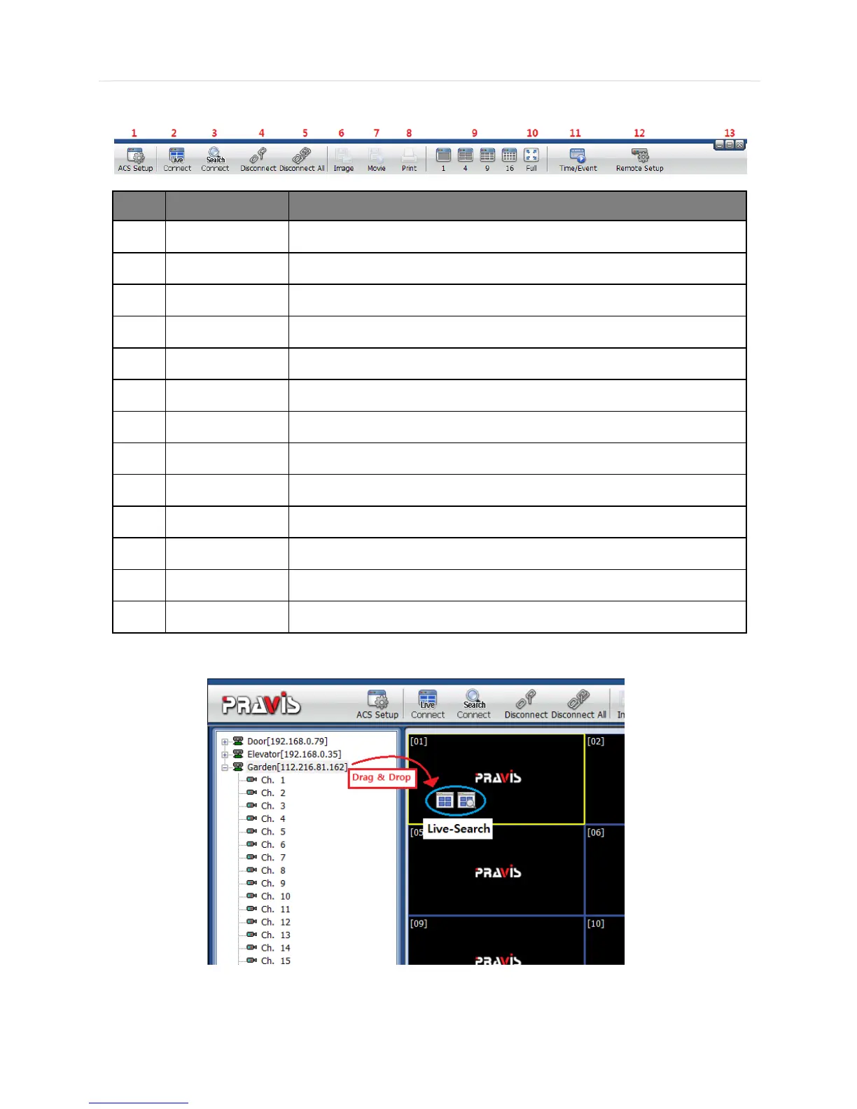 - The site list panel shows registered DVR lists. To make a connection, Drag & Drop the site or camera and then select between