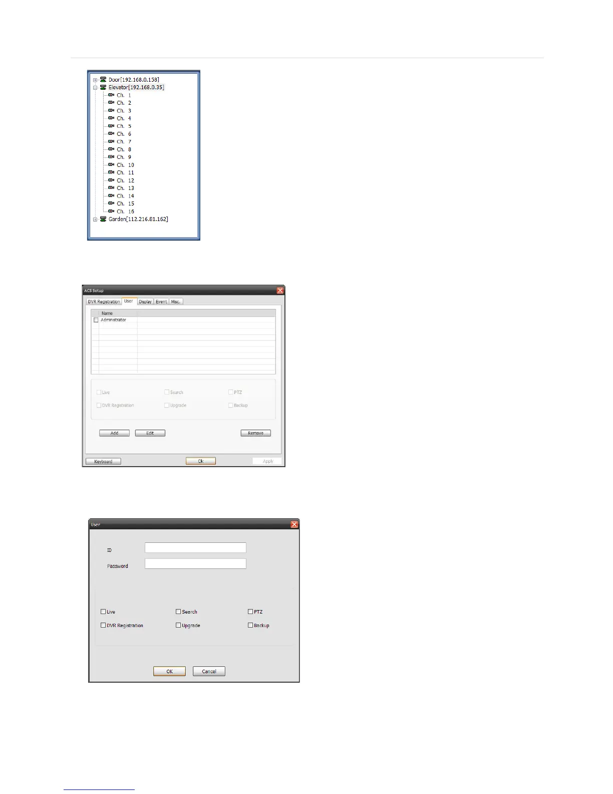User authority can be changed by Administrator. “admin” is the built-in account for administrating the DVR and ACS program.
