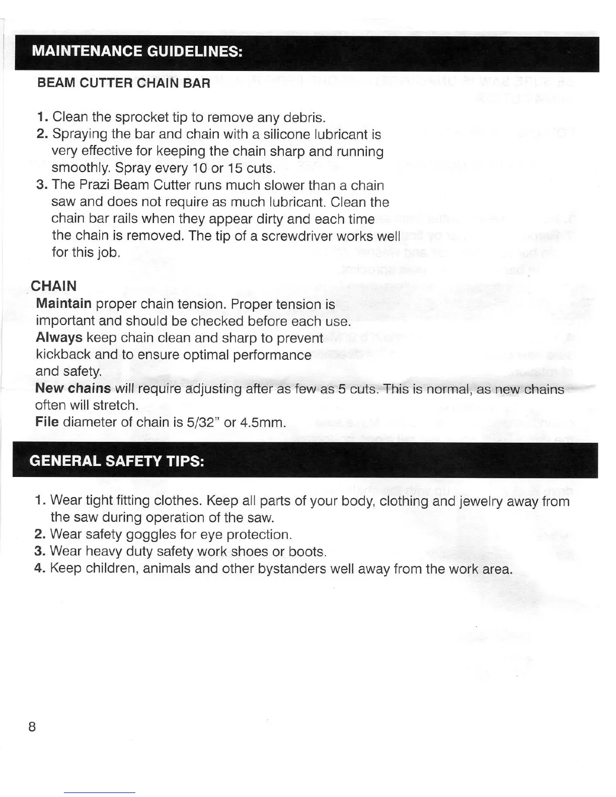 Prazi PR-2700 - Maintenance Guidelines; Beam Cutter Chain Bar Care; Chain Maintenance and Tension; General Safety Tips