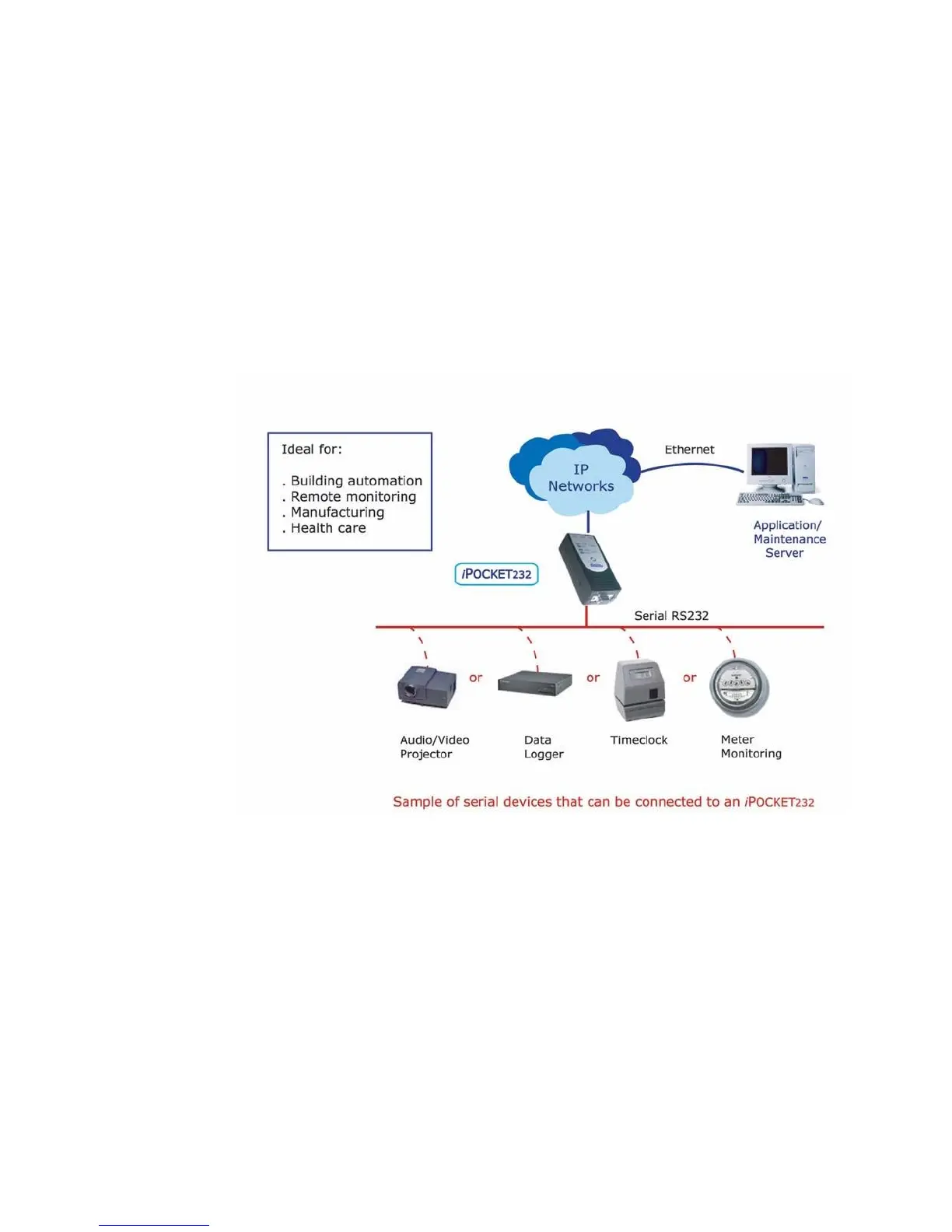 The figure below illustrates an example configuration of the iPocket232 in a network.