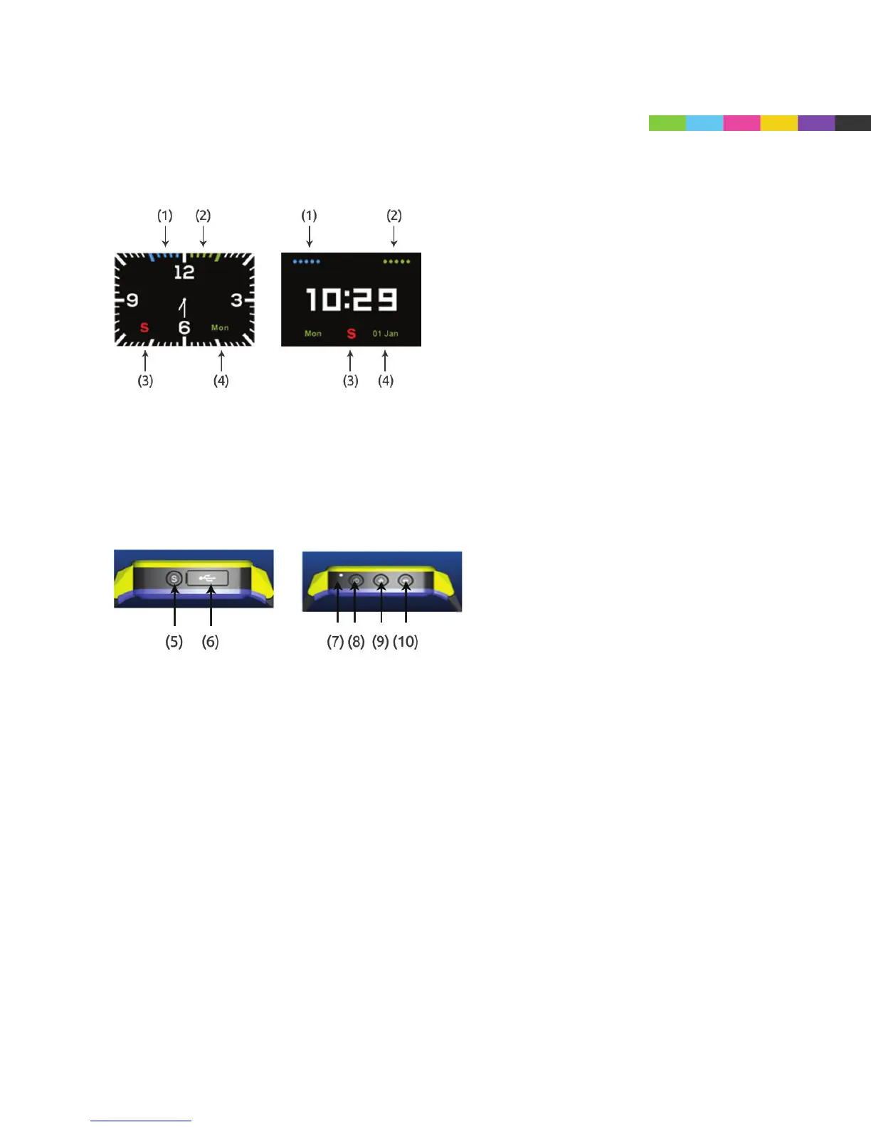 (8): Power Button: Shortly press to change clock interface (digital/traditional) - Hold