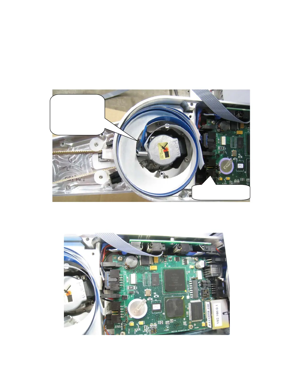 13. Remove the RS485 10 conductor ribbon cable from the robot by feeding the connector up past