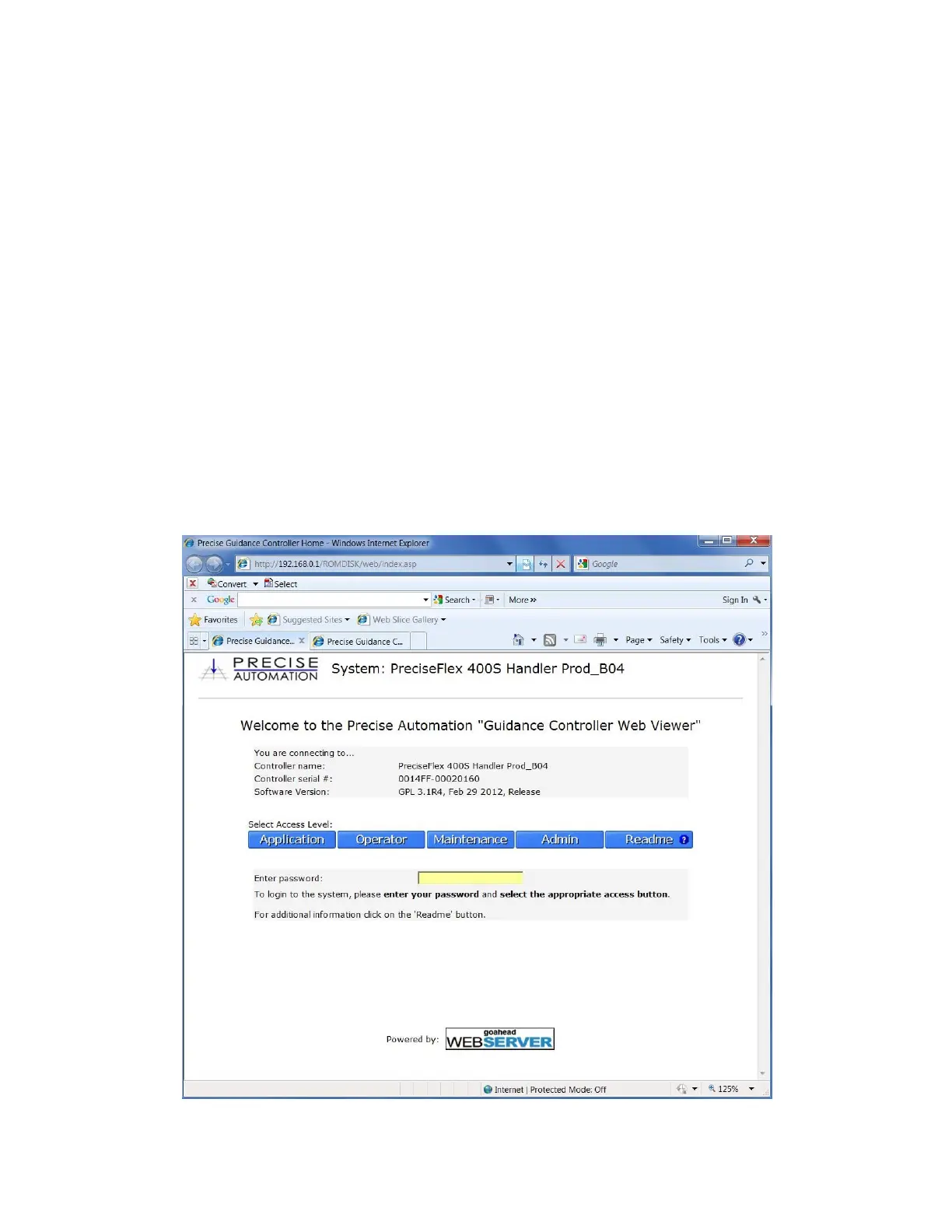 The Web Server Interface may be addressed by opening a browser (such as Internet Explorer) in a PC