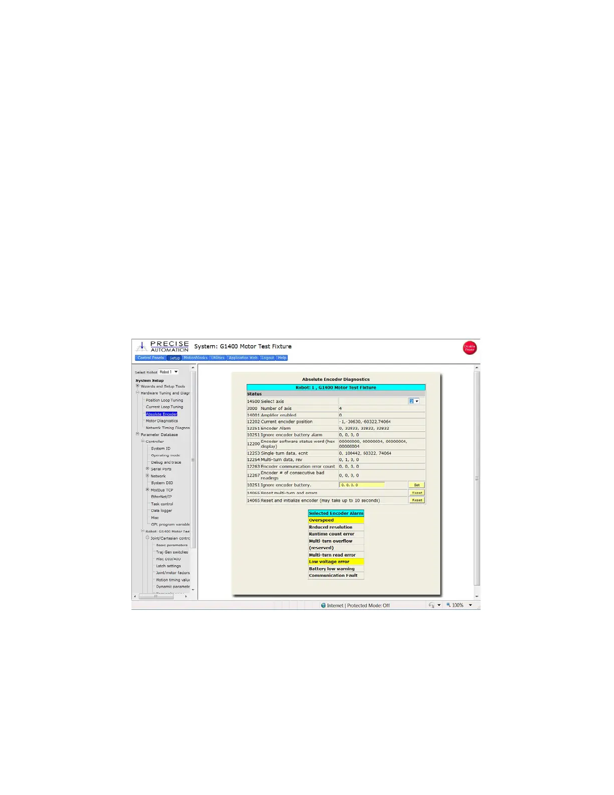selecting the reset button next to “Reset and initialize encoder”. This button resets error flags, but