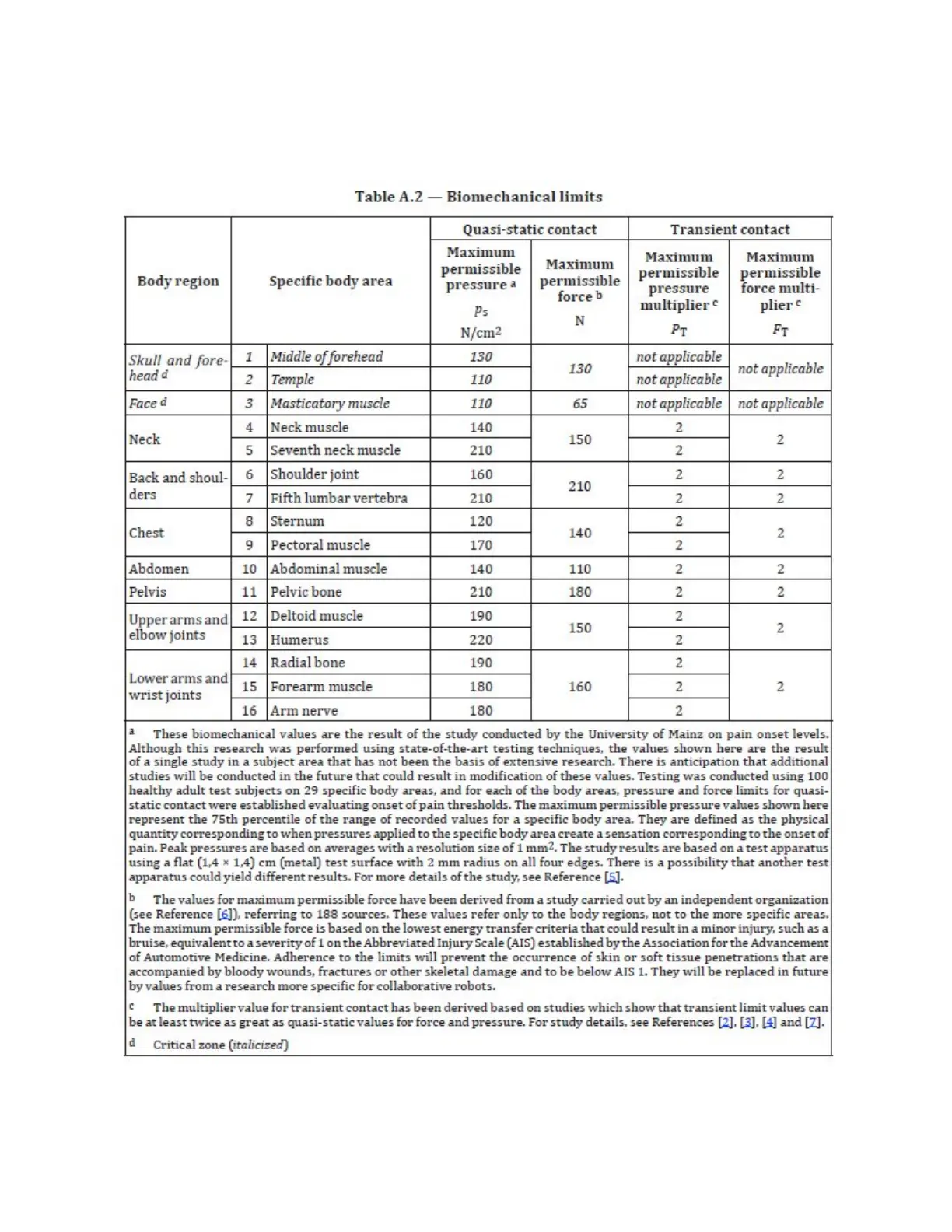 PreCise PF400 - Table A2 from ISO;TS 15066: 2016; Biomechnical Limits