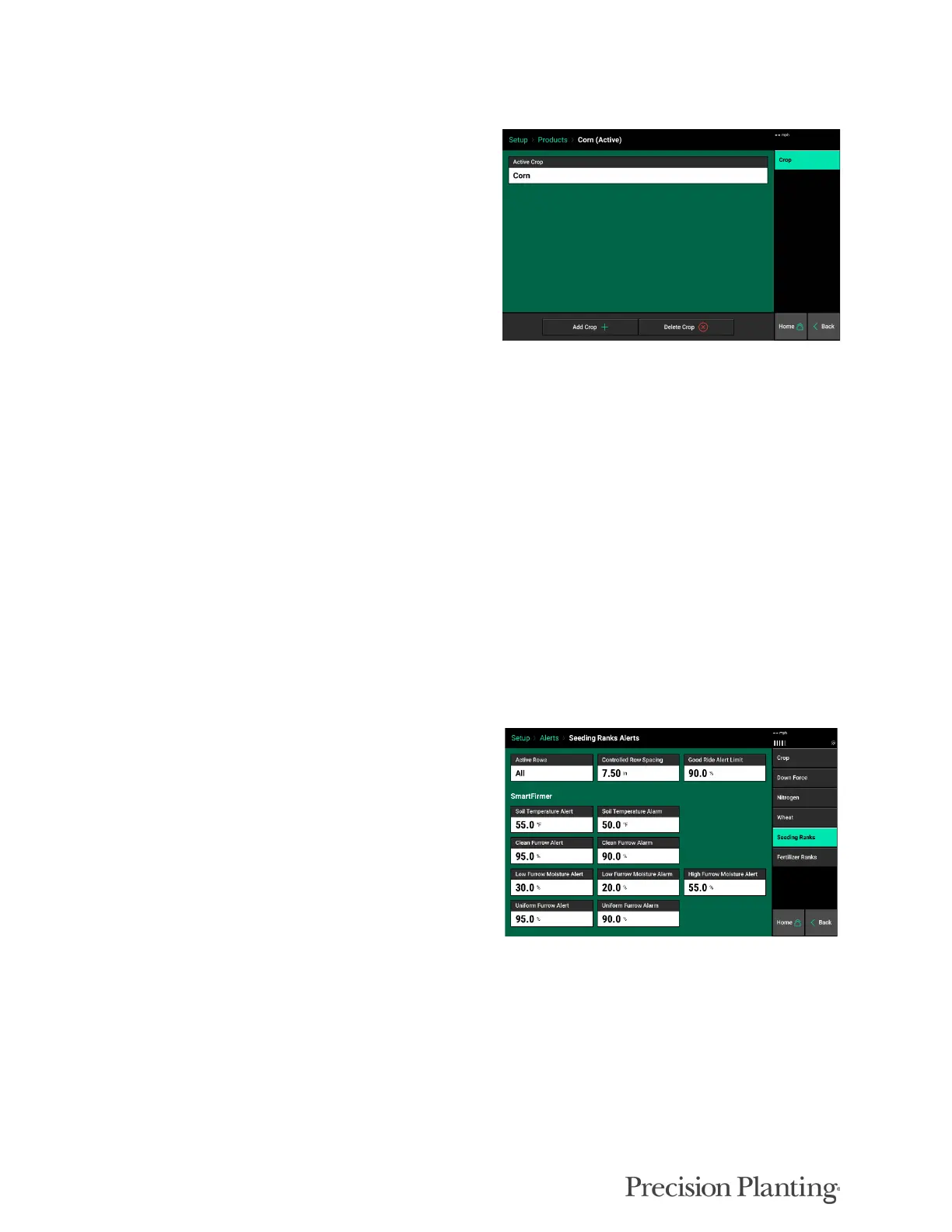 The Air Seeder Alerts (or Seeding and Fertilizer Ranks if applicable) screen allows for a number