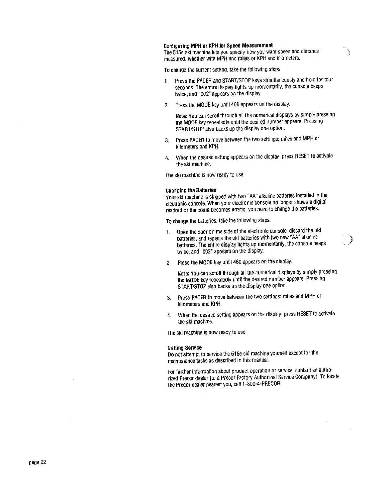 Precor 515e - Configuring MPH or KPH for Speed Measurement; Changing the Batteries; Getting Service