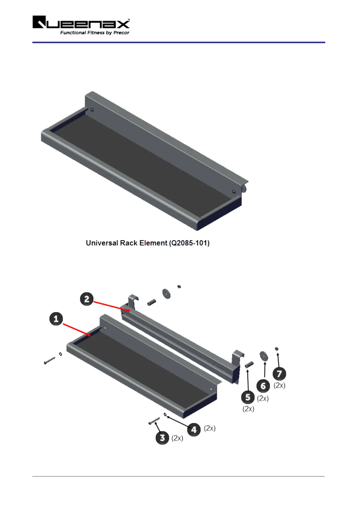 1. Attach the horizontal removable rack onto the universal rack element. Secure using the
