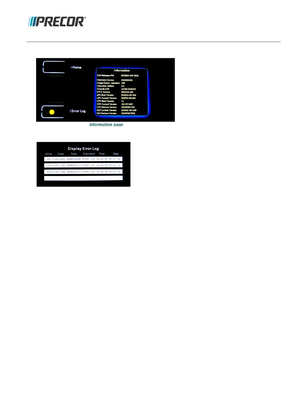 3. Select Error Log softkey (Information page) to open the Display Error Log page.