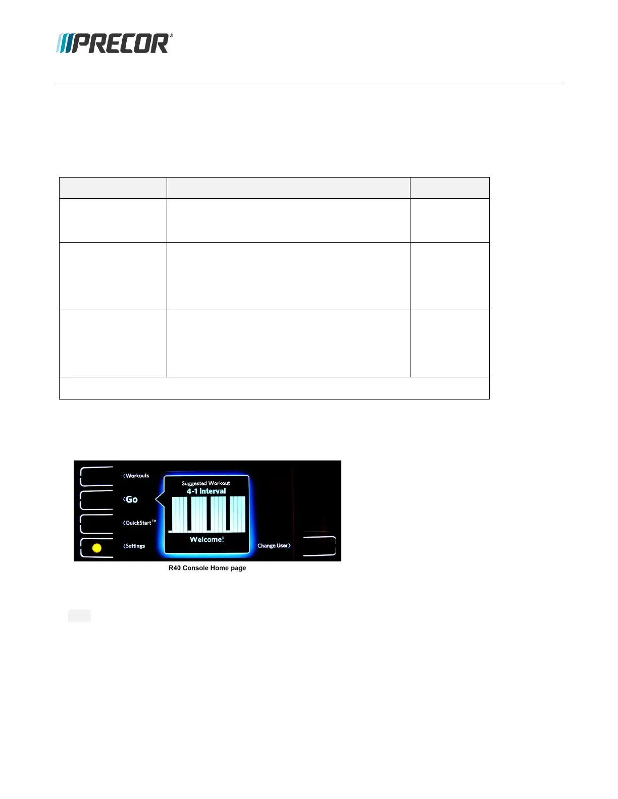 The R40 console provides the following set of standardized Precor equipment Service software and Access