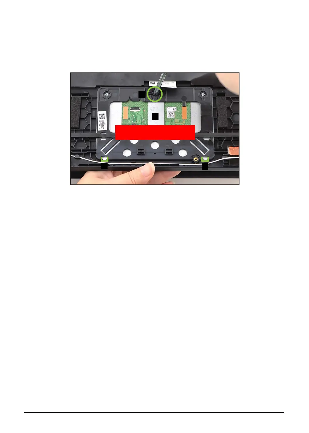 5. Slide the touchpad module slightly to disengage it from the bottom latches (D), and