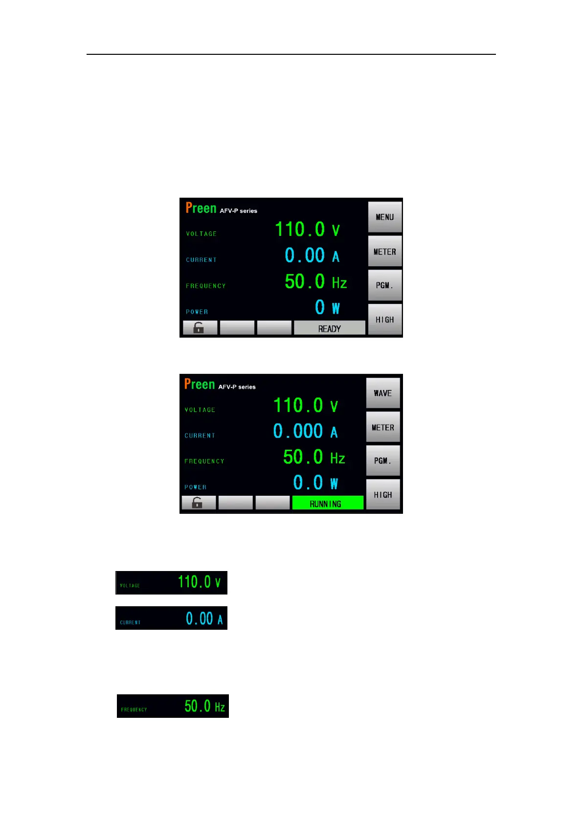 power-on procedures. The MAIN page shows the output settings and the measure-