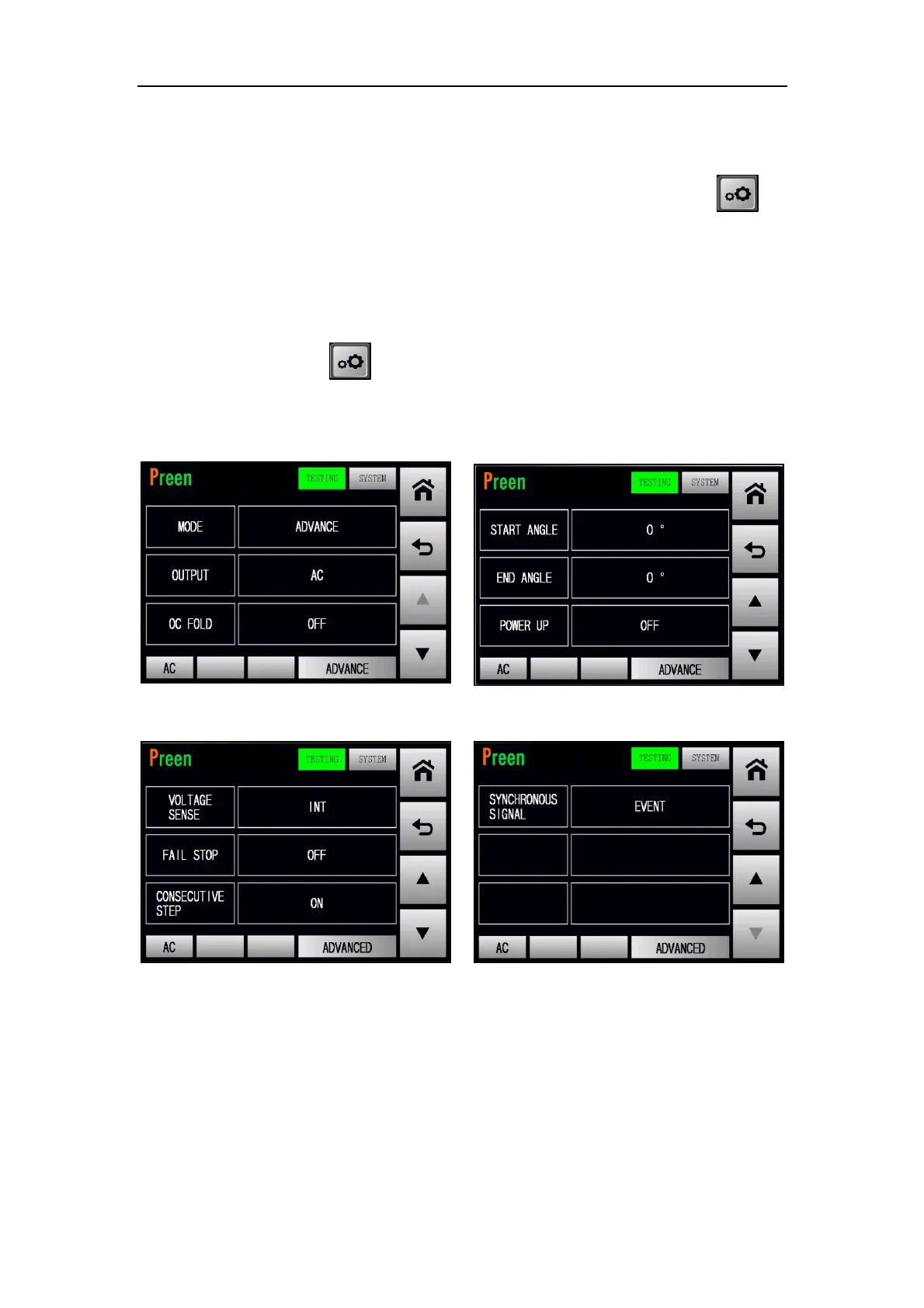 page at the ADVANCED mode will be shown on the touch screen in advance, and the
