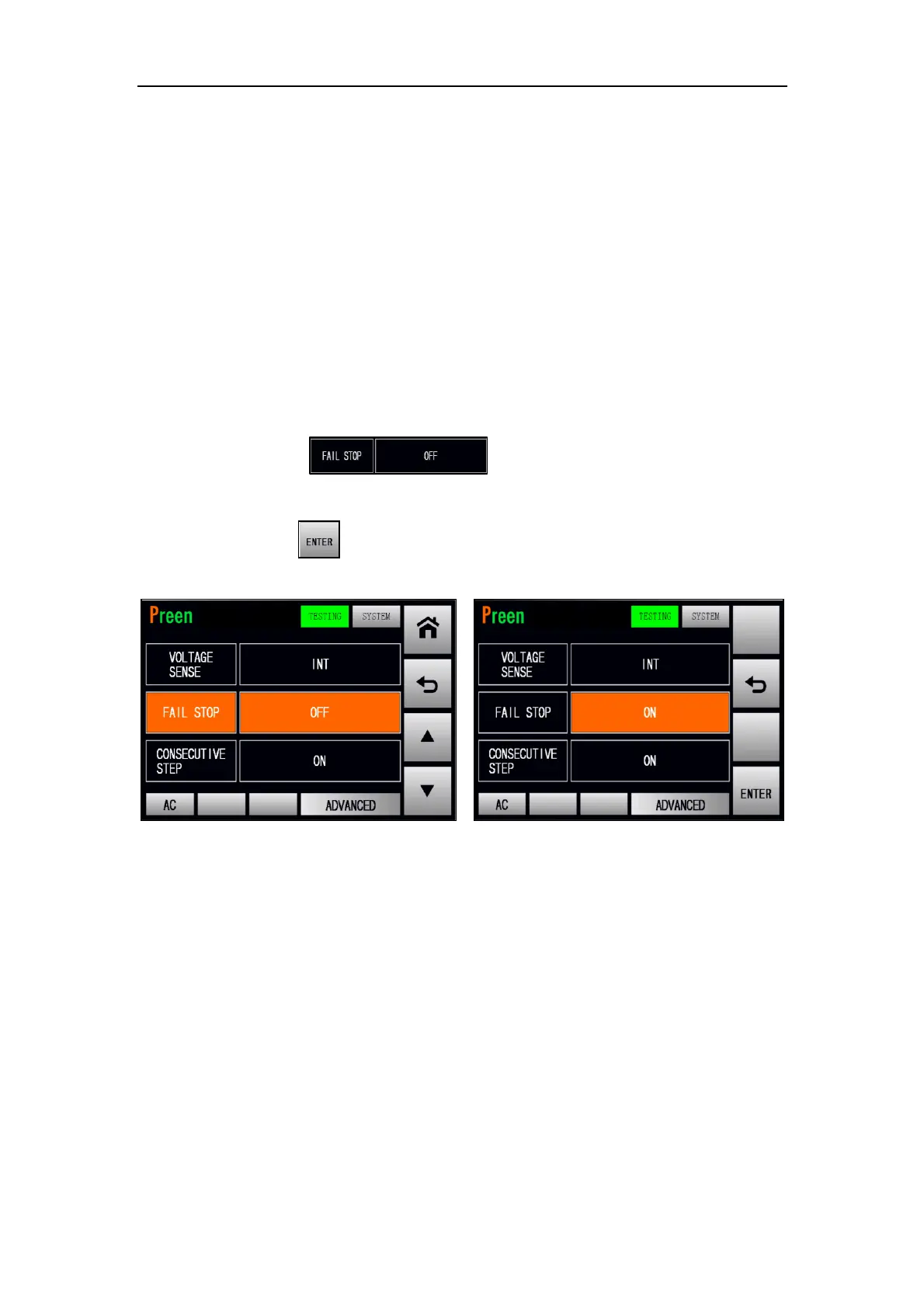 At the TESTING subpage 3 (ADVANCED mode), users are allowed to enable the fail