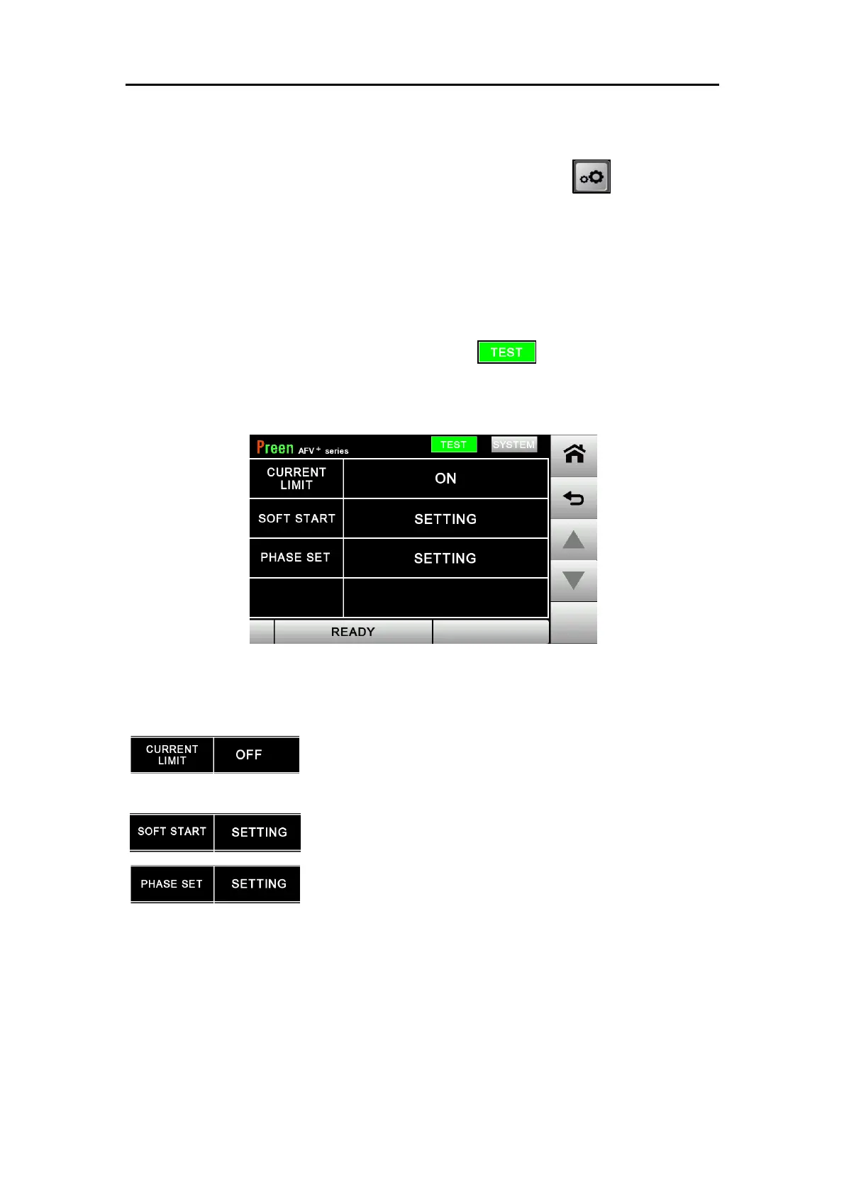SETTING page. The SETTING page includes two subpages: TEST subpage and SYSTEM