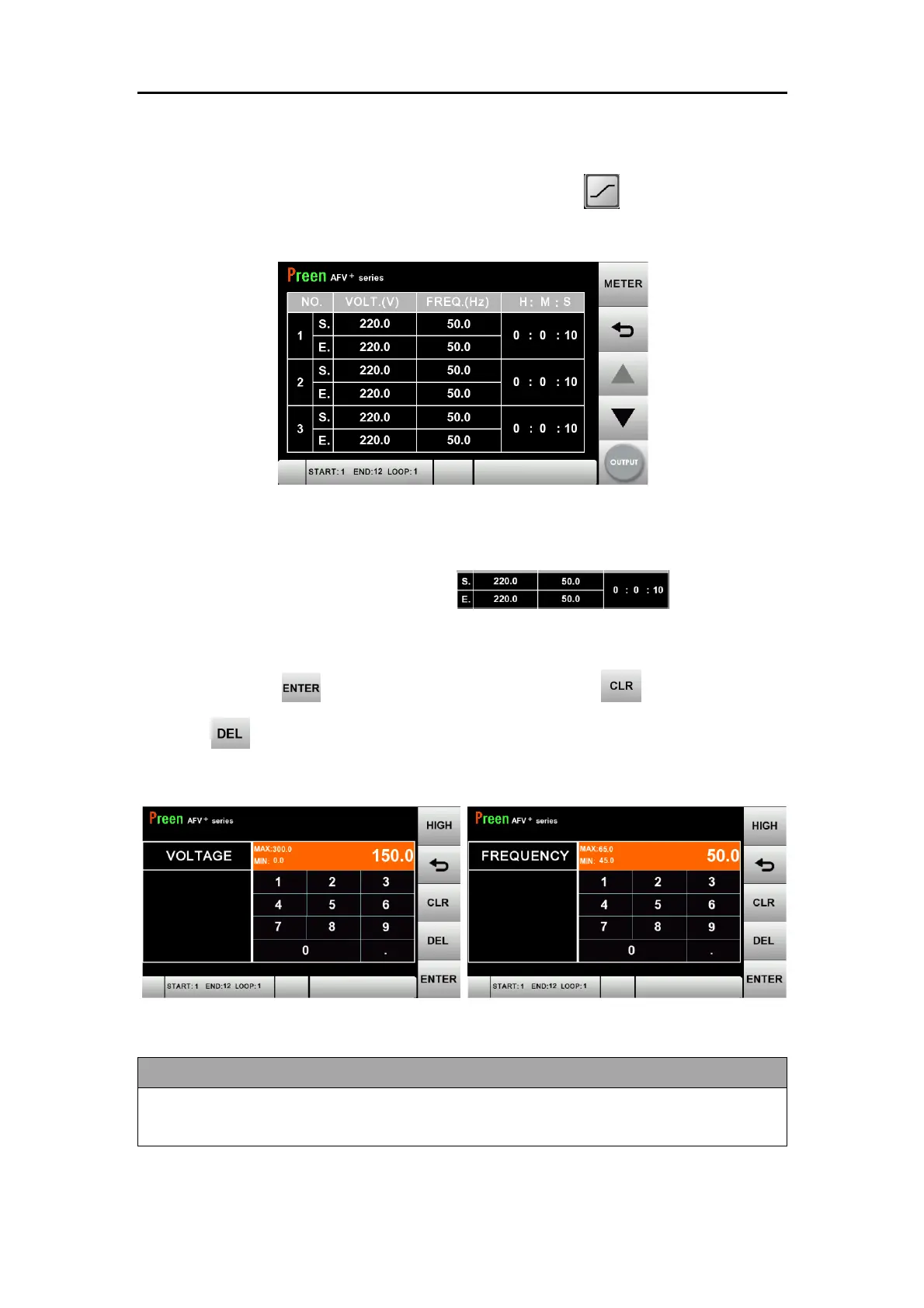 set to set start and end output voltage/frequency and dwell time. When setup is