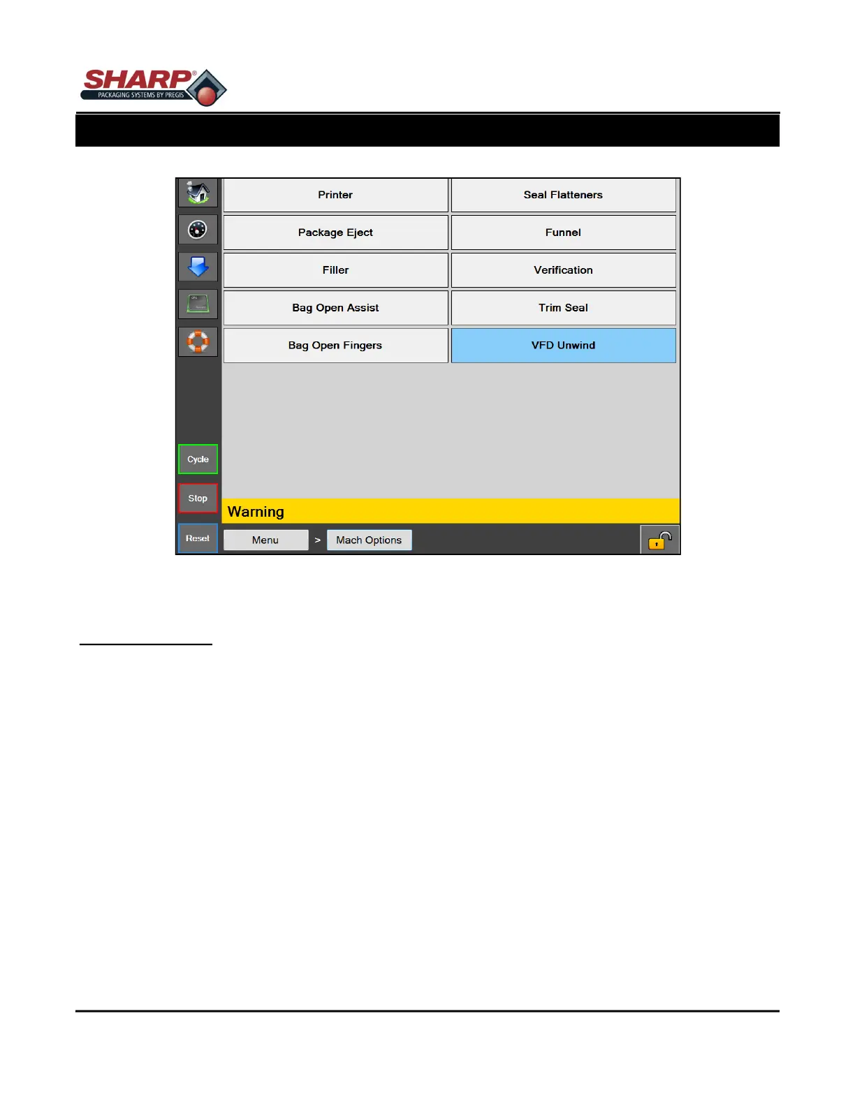 The Machine Options screen displays the many options that can be installed and selected on the bagger. (Not