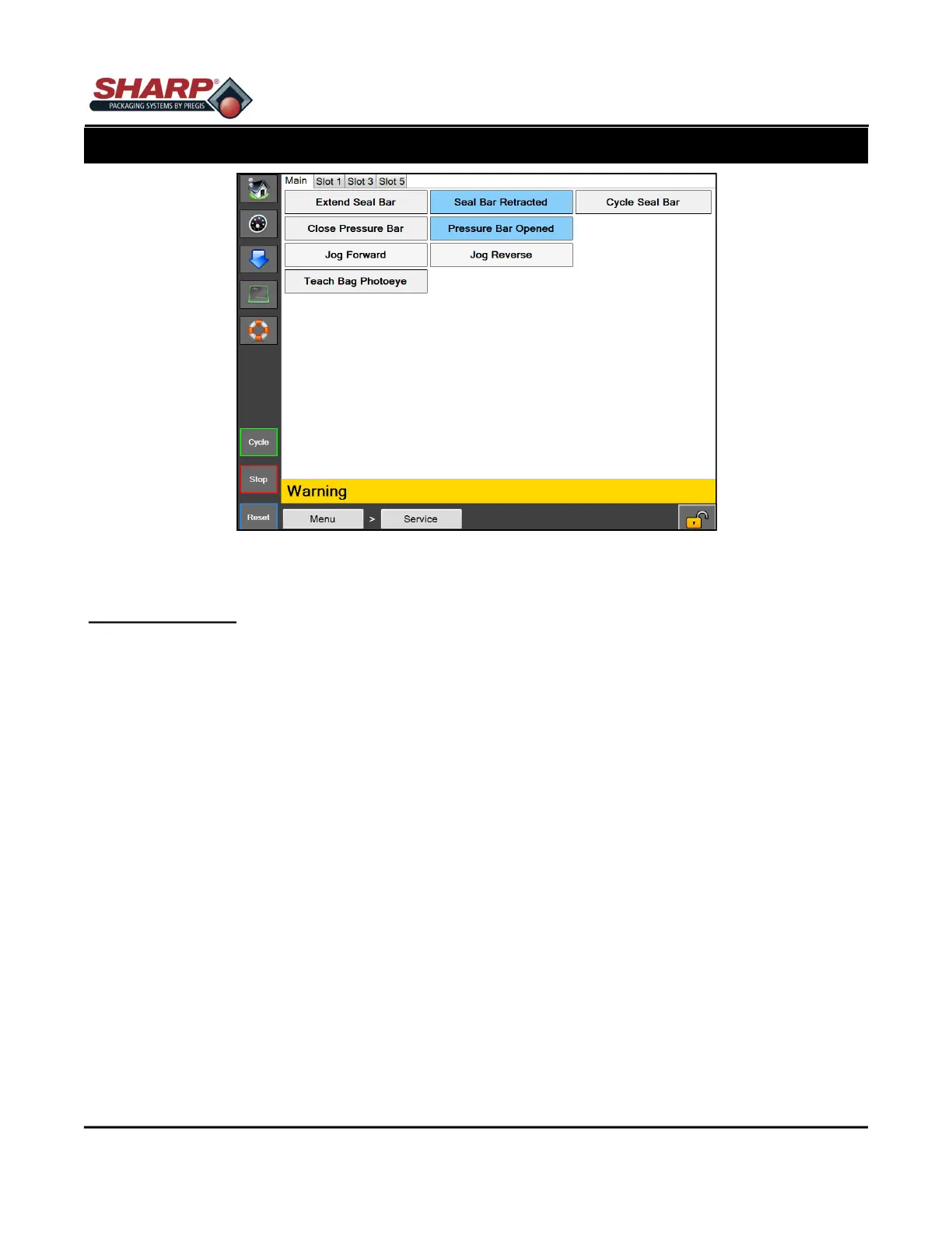 Retract Seal Bar - This will retract the seal bar. The button will display Seal Bar Retracted when the Seal Bar