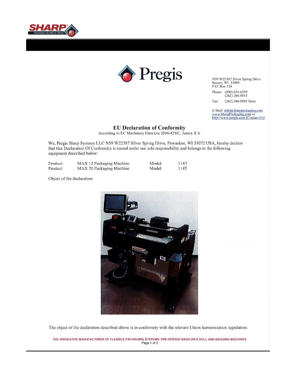 Pregis SHARP MAX 1143 - CE Manufacturer Declaration