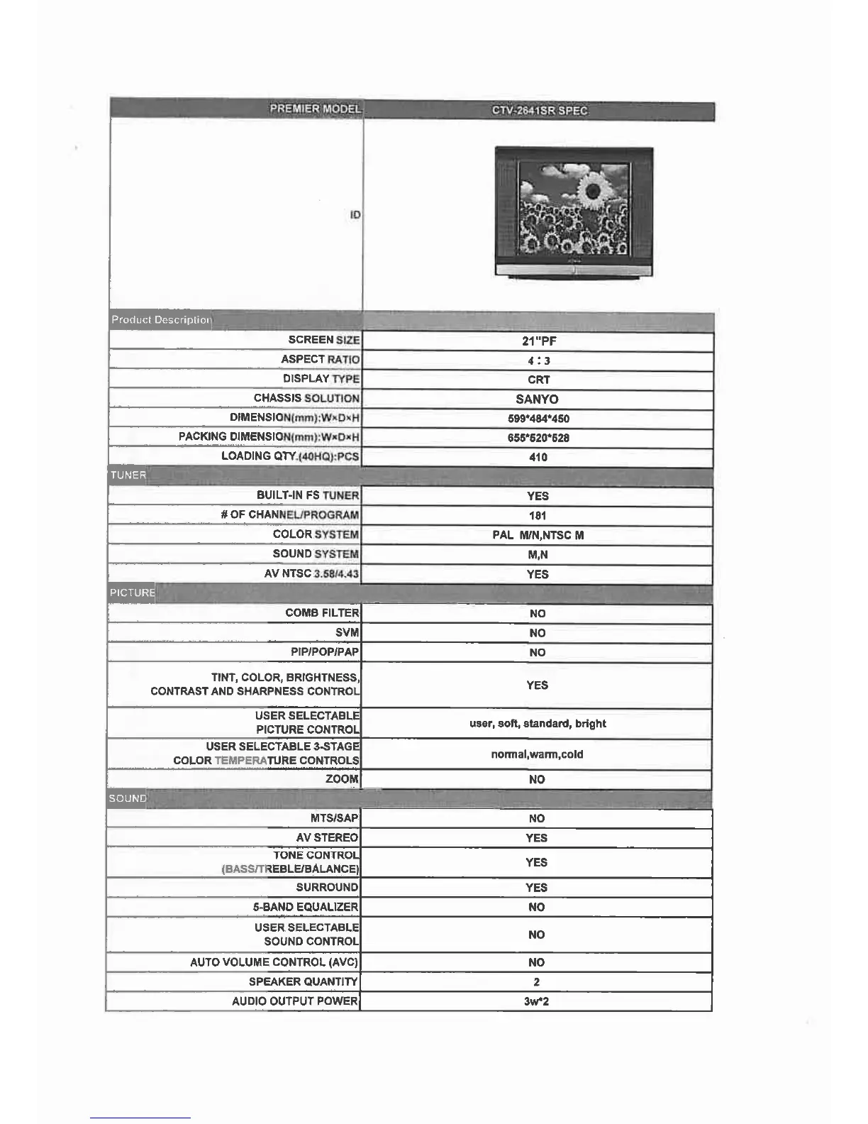 Premier ctv-2641sr - CTV-2641 SR Specifications - Part 1; Chassis, Tuner, and Picture Specs; Sound System and Controls