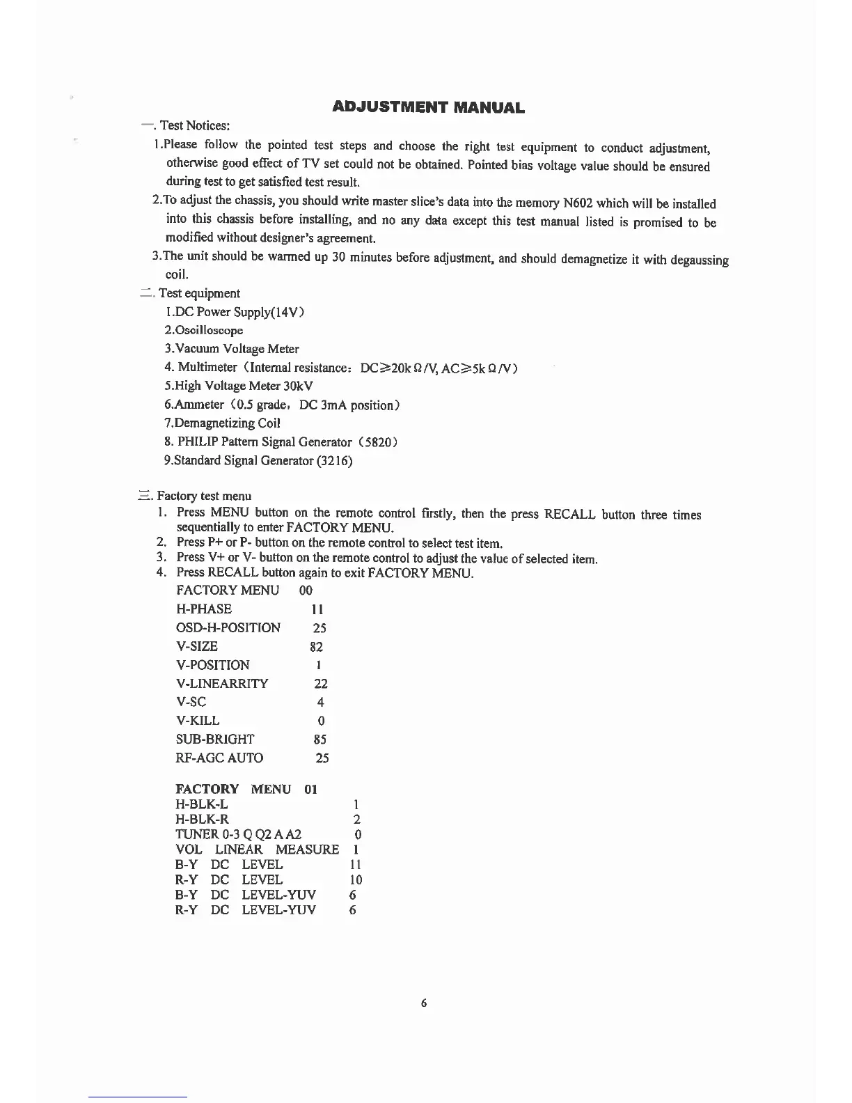 Premier ctv-2641sr - Adjustment Manual - Part 1; Initial Test Recommendations; Factory Menu Navigation