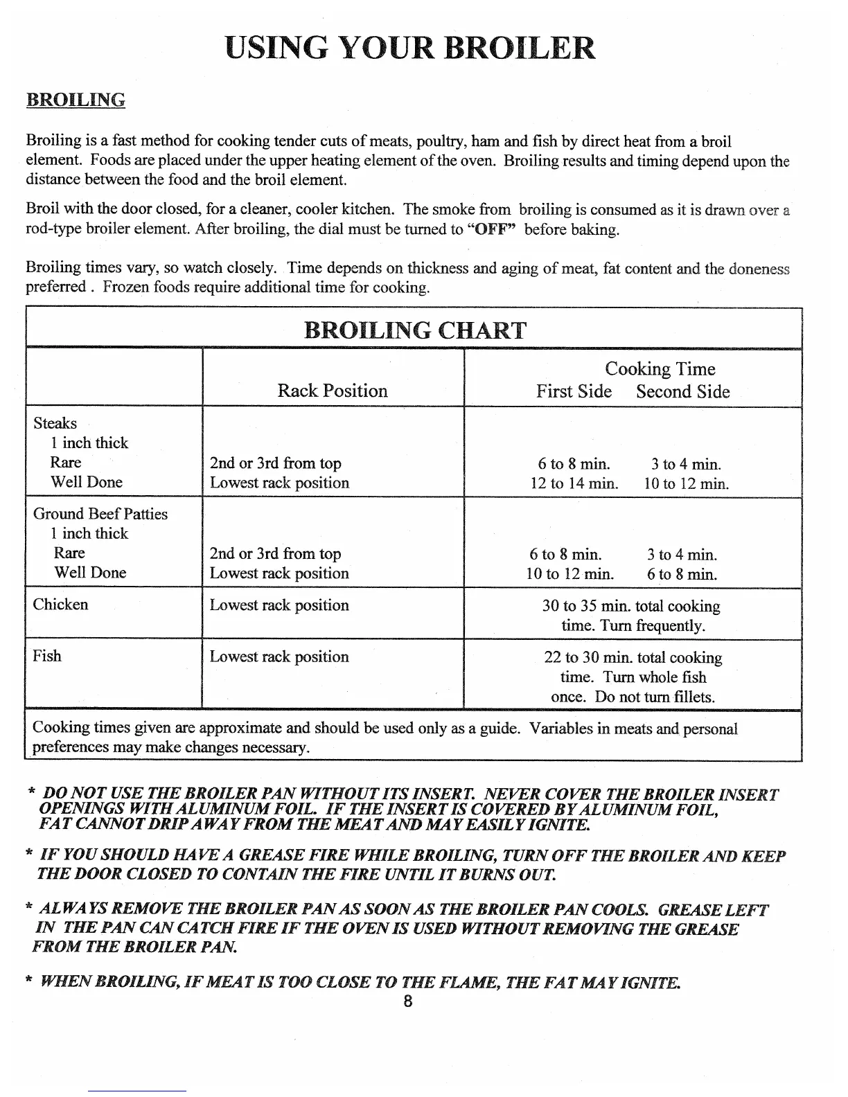 Premier EAKL0AOP - Using Your Broiler; Broiling Operation and Chart