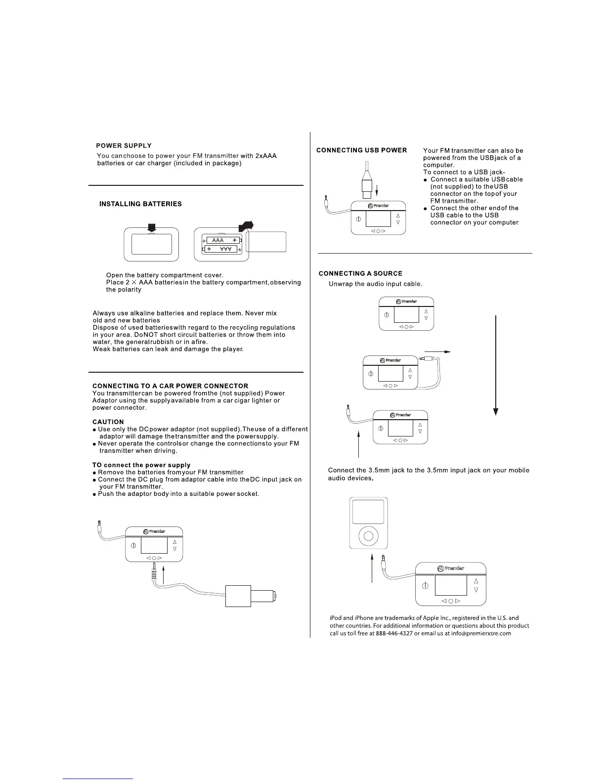 Premier PWFMT1 - POWER SUPPLY; Installing Batteries; Connecting USB Power; Connecting Audio Source