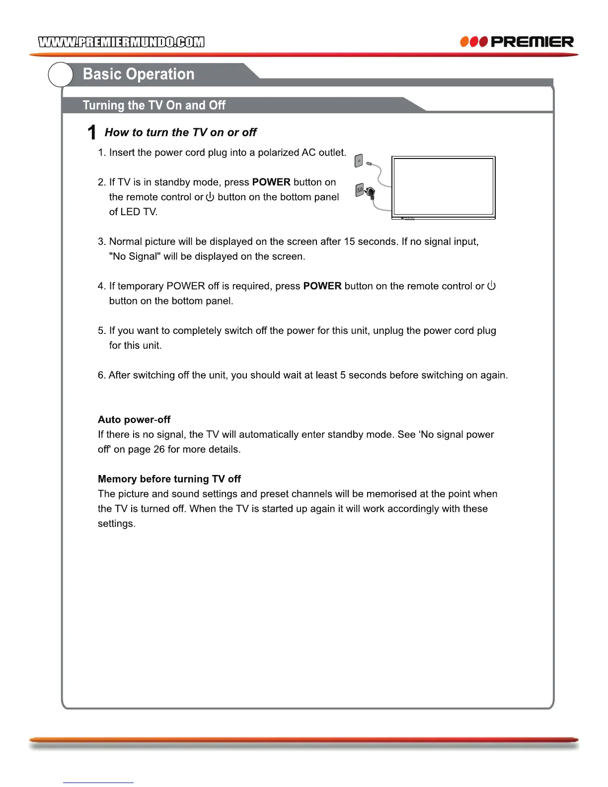 Premier TV-4802LED - Basic TV Operations; Turning the TV On and Off; Automatic Power Off Function; Settings Memory Before Power Off