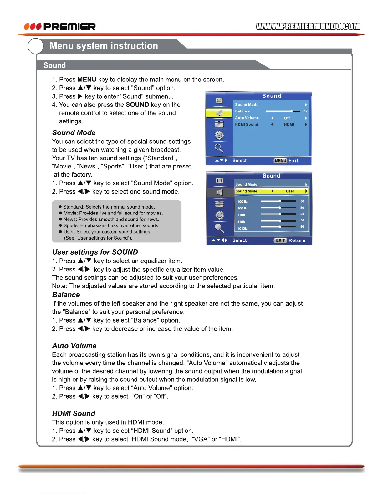 Premier TV-4802LED - Sound Settings; Sound Mode Selection; User Sound Adjustments; Speaker Balance Control